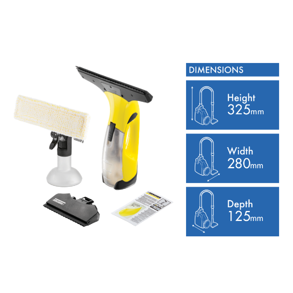 Make light work of cleaning windows mirrors tiles and more with the versatile Karcher Window Vac WV2PLUS N. This lightweight cordless handheld vacuum comes equipped with a lithium-ion battery that provides up to 25 minutes of runtime per charge while the included fast charger juices up the battery in just 185 minutes. The bright yellow design houses a 0.6kg compact body measuring 120 x 180 x 320mm making storage a breeze. Simply attach the exchangeable suction nozzle to tackle wet or dry spills on smooth surfaces. The Window Vac makes it easy to banish streaks dust and dirt from your home. With a concentrated window cleaning solution and handy accessories included this is the perfect cleaning companion. Tackle condensation drink spills and more with ease thanks to the Window Vac. The manufacturer's part number for this product is 1.633-215.0. Check out the Karcher Window Vac WV2PLUS N today.