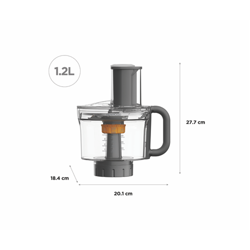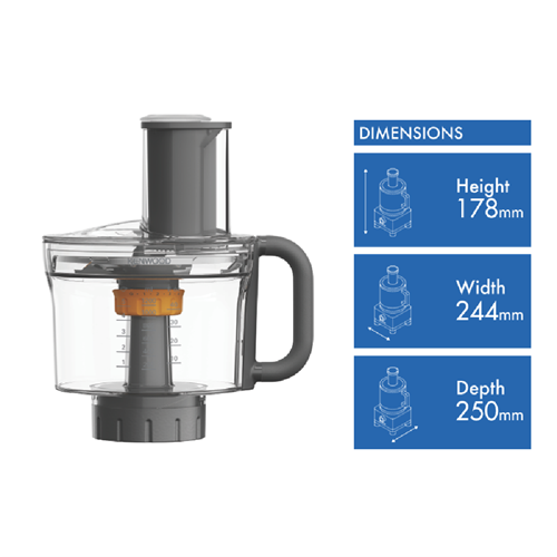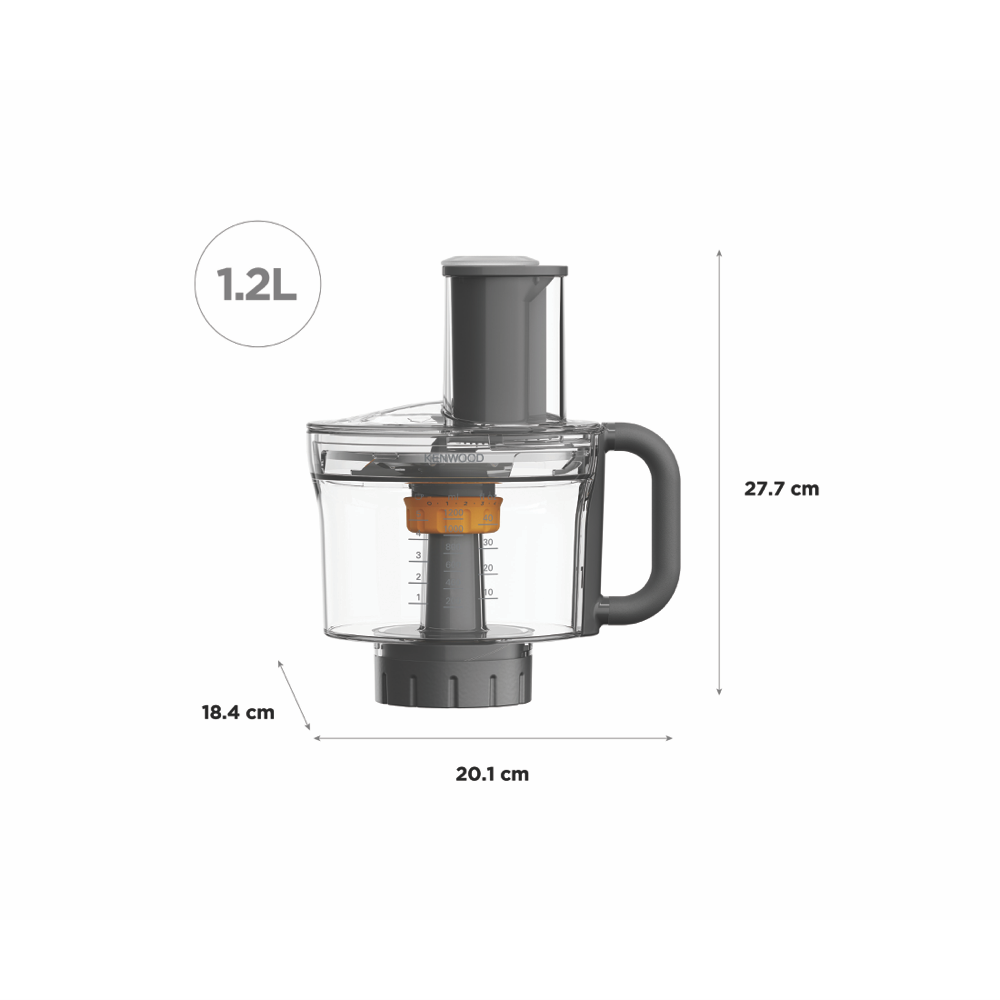 A quality kitchen companion the Kenwood Food Processor Attachment brings convenience and versatility to your meal prep. With a generous 1.2 litre capacity bowl and 6 handy discs included this attachment helps you slice grate knead and blend ingredients with ease. Whether you're preparing family feasts or quick weeknight dinners the food processor attachment saves you time and effort in the kitchen. At 178mm high 244mm wide and 250mm deep it fits most Kenwood mixers and weighs just 2.2kg for portability. Covered by a 1 year warranty for peace of mind. Transform your Kenwood mixer into a food prep powerhouse with the Kenwood Food Processor Attachment KAH65000PL.