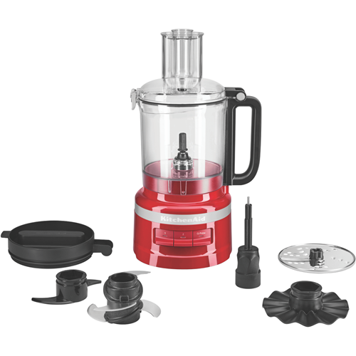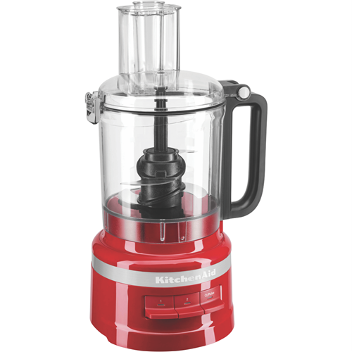 Whether you're looking to chop slice shred or blend the KitchenAid Empire Red Food Processor has you covered. This versatile kitchen appliance features a powerful motor and stainless steel blades to tackle all your food prep needs with precision and ease. The spacious 9 cup work bowl provides plenty of room for larger batches while the 2-in-1 feed tube allows you to process foods of different sizes. With low high and pulse speeds you're in complete control over the texture of anything you make. The dishwasher-safe parts ensure quick cleanup when you're done. With a dough blade multi-purpose blade whisk accessory and reversible slicing/shredding disc included this food processor comes equipped with everything you need to mix knead grate and more. Crafted with KitchenAid's signature quality this appliance will be your new go-to for easy meal prep and endless recipe possibilities. The manufacturer's part number for this product is 5KFP0921AER. Bring home the KitchenAid Empire Red Food Processor and take your culinary skills to exciting new heights.