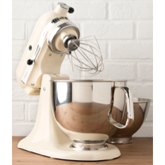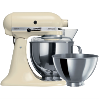 This almond cream KitchenAid Artisan Stand Mixer 5KSM160PSAAC features original planetary mixing action and a reliable direct drive motor to ensure thorough ingredient mixing. It is built to last with a full metal construction making it robust stable and durable. The KitchenAid 5KSM160PSAAC is versatile seeing the attachment hub together with optional accessories transforms the mixer into a pasta maker food grinder vegetable slicer sausage maker and much more. This KitchenAid mixer includes 4.8 litre and 2.8 litre stainless steel mixing bowls a wire whisk flat beater and dough hook. Experience fast thorough mixing and flexibility with KitchenAid's Artisan Stand Mixer.