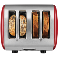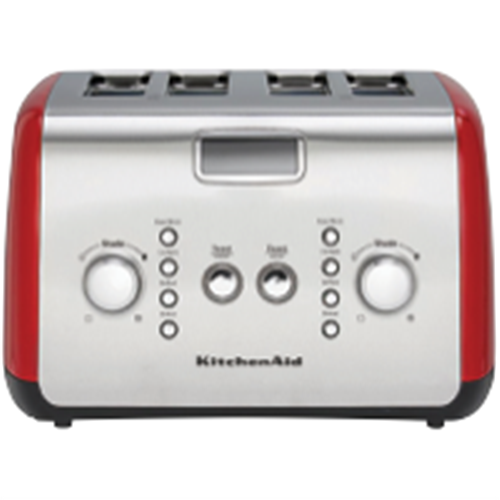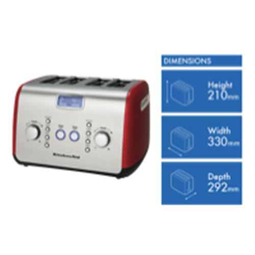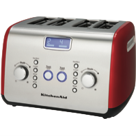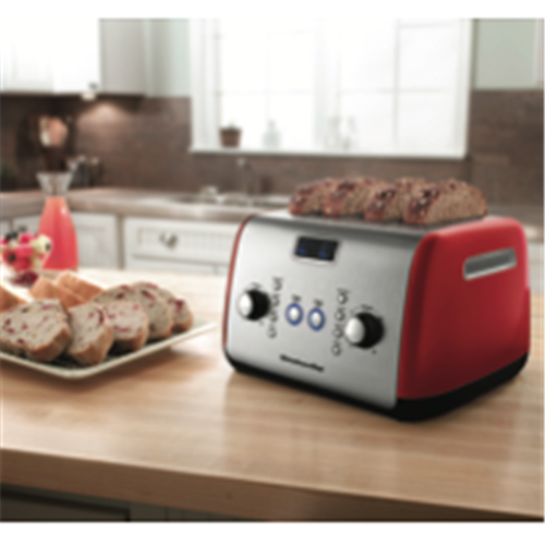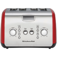 This KitchenAid Artisan 4 Slice Toaster 5AKMT423ER in Empire Red offers variable browning control to suit your tastes. A dedicated crumpet setting toasts one side while warming the other offering versatility in function this KitchenAid toaster's setting also offers the ideal environment for English muffins and bagels. The digital display panels on this 4 slice toaster shows your selected toasting shade and features a progress bar that counts down to the end of the process. The sleek red and stainless steel finish offers a pop of colour to your kitchen and allows you to match your toaster to other red kitchen appliances.
