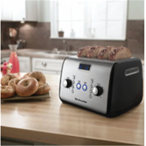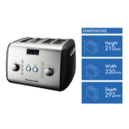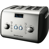 This KitchenAid Artisan 4 Slice Toaster 5AKMT423OB in Onyx Black offers variable browning control to suit your tastes. A dedicated crumpet setting toasts one side while warming the other offering versatility in function this KitchenAid toaster's setting also offers the ideal environment for English muffins and bagels. The digital display panels on this 4 slice toaster shows your selected toasting shade and features a progress bar that counts down to the end of the process. The sophisticated black and stainless steel finish easily suits the contemporary kitchen and allows you to match your toaster to other black kitchen appliances.
