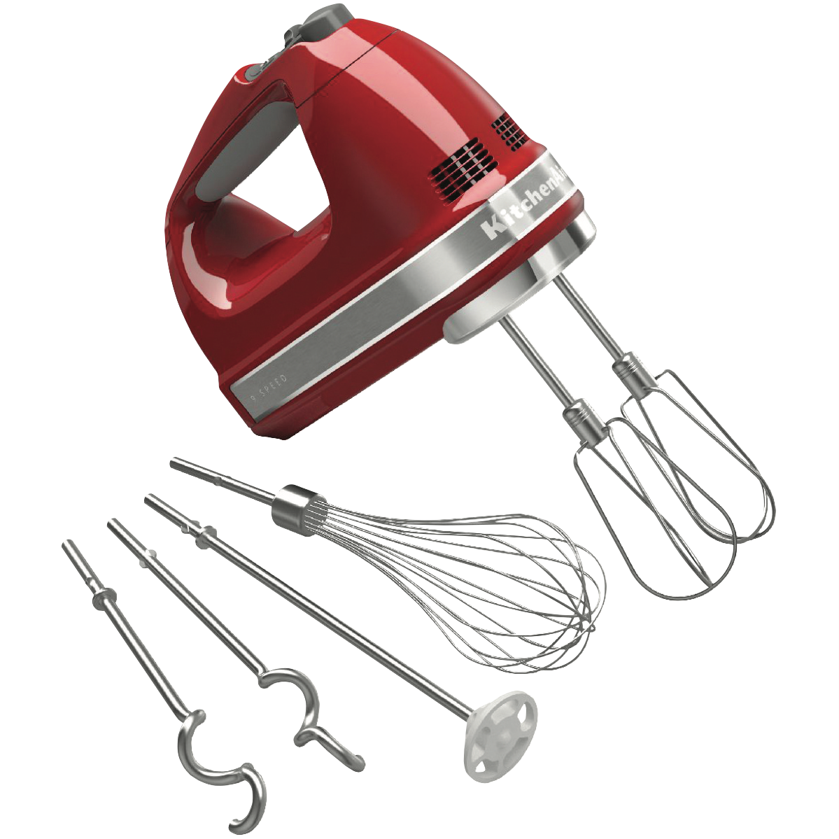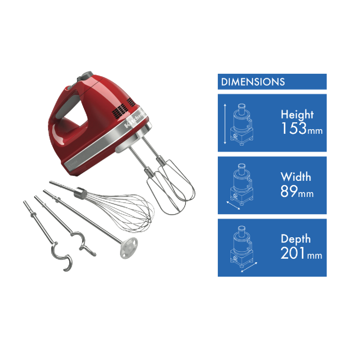 This KitchenAid Empire Red Hand Mixer is a must-have kitchen appliance for any home chef looking to whip up delectable baked goods and culinary creations with ease. Featuring a powerful 85-watt motor and 9 speed settings including slow stir and fast whip this hand mixer makes quick work of mixing whipping and kneading ingredients. The soft grip handle provides comfort while the stainless steel turbo beater whisk dough hooks and liquid blending rod handle all your mixing needs. The efficient motor and multiple accessories allow you to stir blend mix and knead everything from cake batters to pizza dough. This hand mixer is lightweight at just 2kg and compact in size at 153mm high x 89mm wide x 201mm deep for easy storage. The empire red color will add a pop of vibrant color to your kitchen. Dishwasher safe parts make cleanup a breeze. Backed by KitchenAid's 2 year warranty this hand mixer delivers solid performance and durability. The manufacturer's part number for this product is 5KHM926AER. Bring home the KitchenAid Empire Red Hand Mixer and unlock your full baking potential with its power and versatility.