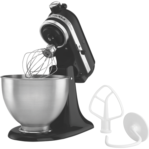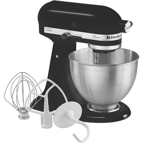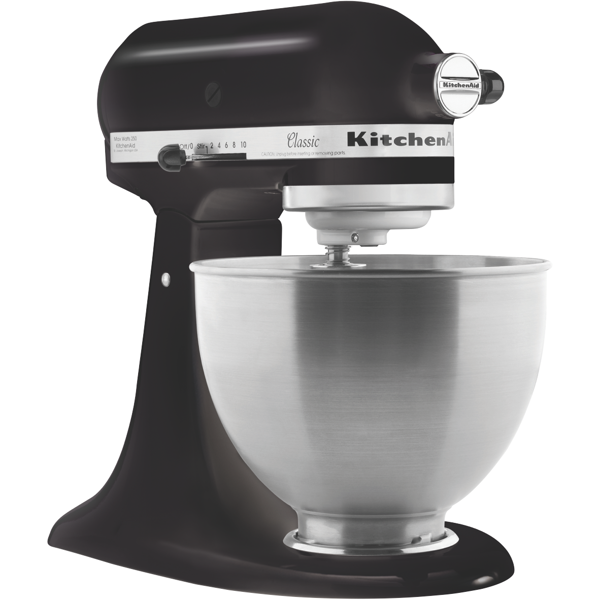 Discover the power of a classic with the KitchenAid Onyx Black Classic Stand Mixer. This iconic mixer is crafted with a durable metal die cast construction and features the planetary mixing action that KitchenAid is known for allowing the beater to touch 67 different points in the bowl for fast thorough mixing. With 10 speed settings and a 4.3L stainless steel bowl you can mix knead and whip ingredients with ease. The locking tilt-head design provides convenient access for attaching accessories. This versatile mixer comes equipped with essential attachments including a flat beater wire whisk and dough hook. Weighing 11.5kg it has a sturdy build that will stand the test of time. The 5 year manufacturer's warranty provides peace of mind. Bring home the timeless KitchenAid Classic Stand Mixer in a sleek Onyx Black finish and unlock endless possibilities in your kitchen today. The manufacturer's part number for this product is 5KSM45AOB.