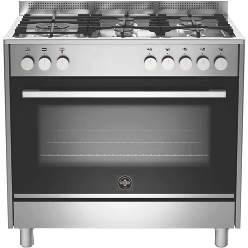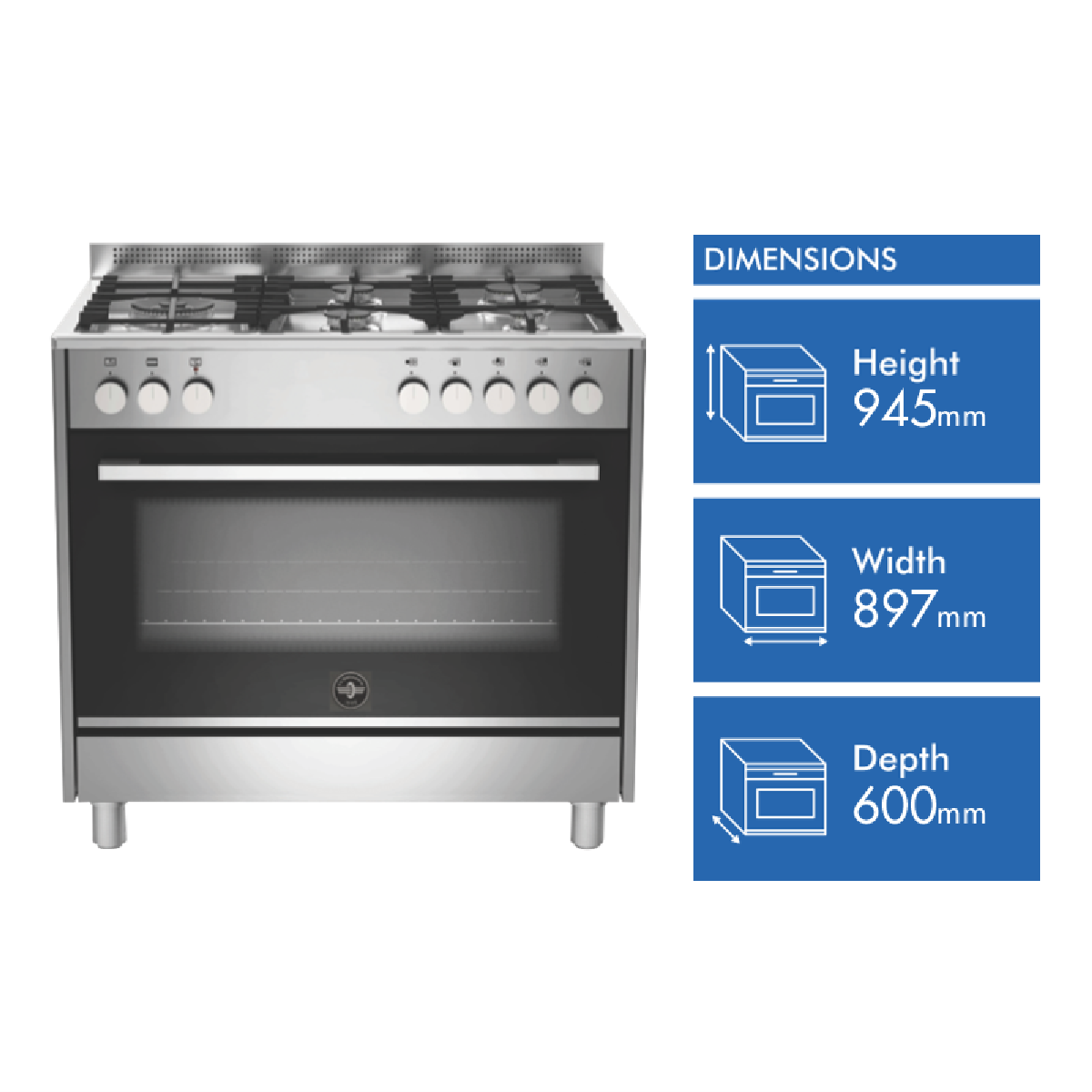 Step up your cooking game with the sleek stainless steel La Germania Futura 90cm dual fuel upright cooker. This powerful freestanding oven combines the precision of electric baking with the responsive heat control of five gas burners giving you the best of both worlds. With a generous 142 litre capacity eleven multifunctional oven modes and a durable build this La Germania model is designed to be the hardworking heart of your kitchen. Bake grill defrost and more with the versatile oven functions. The integrated electric grill means you can skip preheating and start grilling immediately. The five gas burners include a high-powered wok burner delivering the instant precise heat control gas is known for. With smart European styling and stainless steel finish this freestanding cooker will coordinate beautifully with modern kitchen decor. At 897mm wide this spacious La Germania upright cooker will fit most standard 90cm spaces. With the oven at eye level and easy to reach knobs cooking is comfortable and convenient. The two included oven shelves provide ample space for baking multiple dishes at once.Crafted in Italy to La Germania's high standards this dual fuel cooker comes with a 2 year manufacturer's warranty for peace of mind. Its eco-friendly design means the product and packaging are 99% recyclable. The manufacturer's part number for this product is TUS95L61LDX. Discover the joy of cooking with this versatile La Germania upright cooker today.