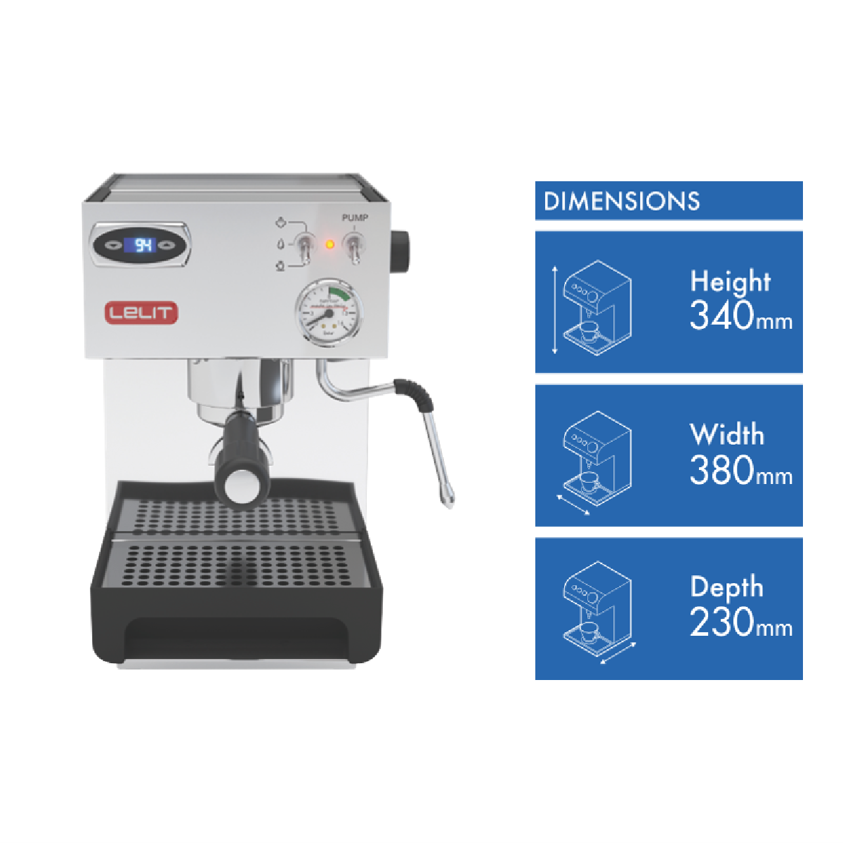 The perfect coffee machine for home baristas the Lelit Anna Manual Espresso Maker crafts café-quality espresso with its 15 bar vibratory pump and True 9 Bar overpressure valve. Brewing espresso is an art and the Anna gives you control over variables like temperature and pressure to pull consistently great shots. The dual brew and steam PID allows setting different extraction temperatures while the brew pressure dial helps optimize your grind. With a fast heat up time and stainless steel body this manual espresso machine looks great on your kitchen counter. The adjustable dual-purpose steam wand froths milk for cappuccinos and lattes. It includes a 2-way filter holder single and double shot filters tamper and measuring spoon. Weighing 7.8kg this espresso machine measures 380mm W x 230mm D x 340mm H. Backed by a 2 year warranty and made in Italy the Lelit Anna brings café quality espresso to your home. Order the Manufacturer Part Number PESAN08PSS2IXX1 model today.