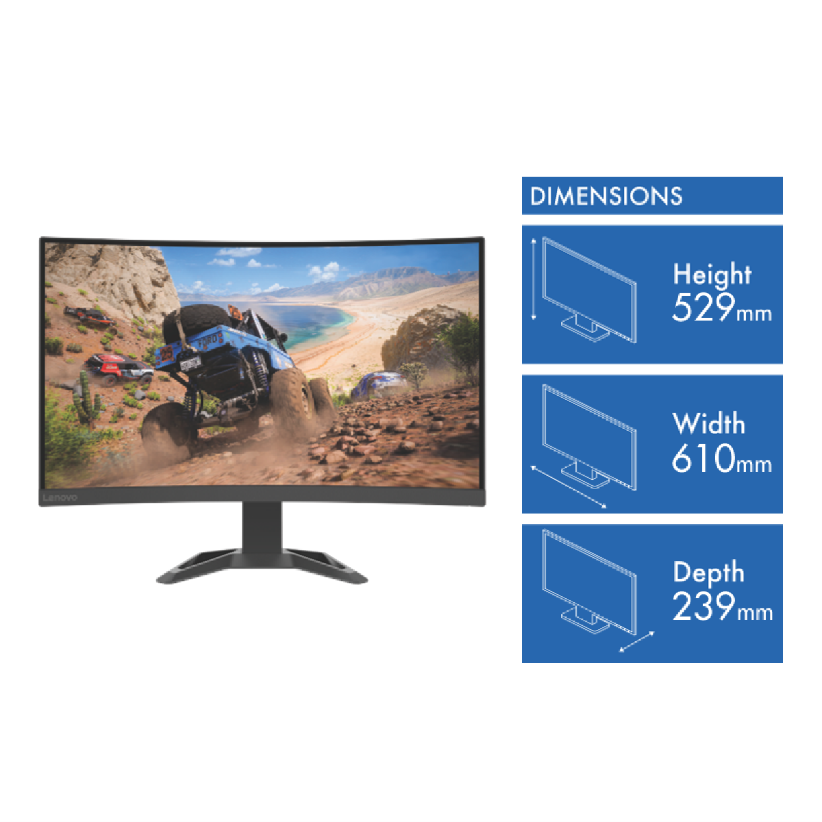 Step into an immersive curved gaming experience with the Lenovo 27 Raven Black QHD Curved Gaming Monitor. Its 1500R VA panel wraps around your field of view with a crisp 2560 x 1440 resolution while AMD FreeSync Premium and an impressive 165Hz refresh rate equip you to game without blur or tear. Minimize eye strain during marathon sessions with a 3000:1 contrast ratio and 350 cd/m2 peak brightness. Adjust the height and tilt to your ideal viewing position then customize crosshairs timers and other in-game enhancements through the onboard menu. Connect your gaming rig with DisplayPort and HDMI then sync RGB lighting effects for an all-encompassing battlestation. Backed by a 3 year warranty this 27 inch Lenovo curved gaming monitor has your back. Ask our customer service about the 66F4GAC2AU model number for more info. Game on fearlessly with the immersive curved display.