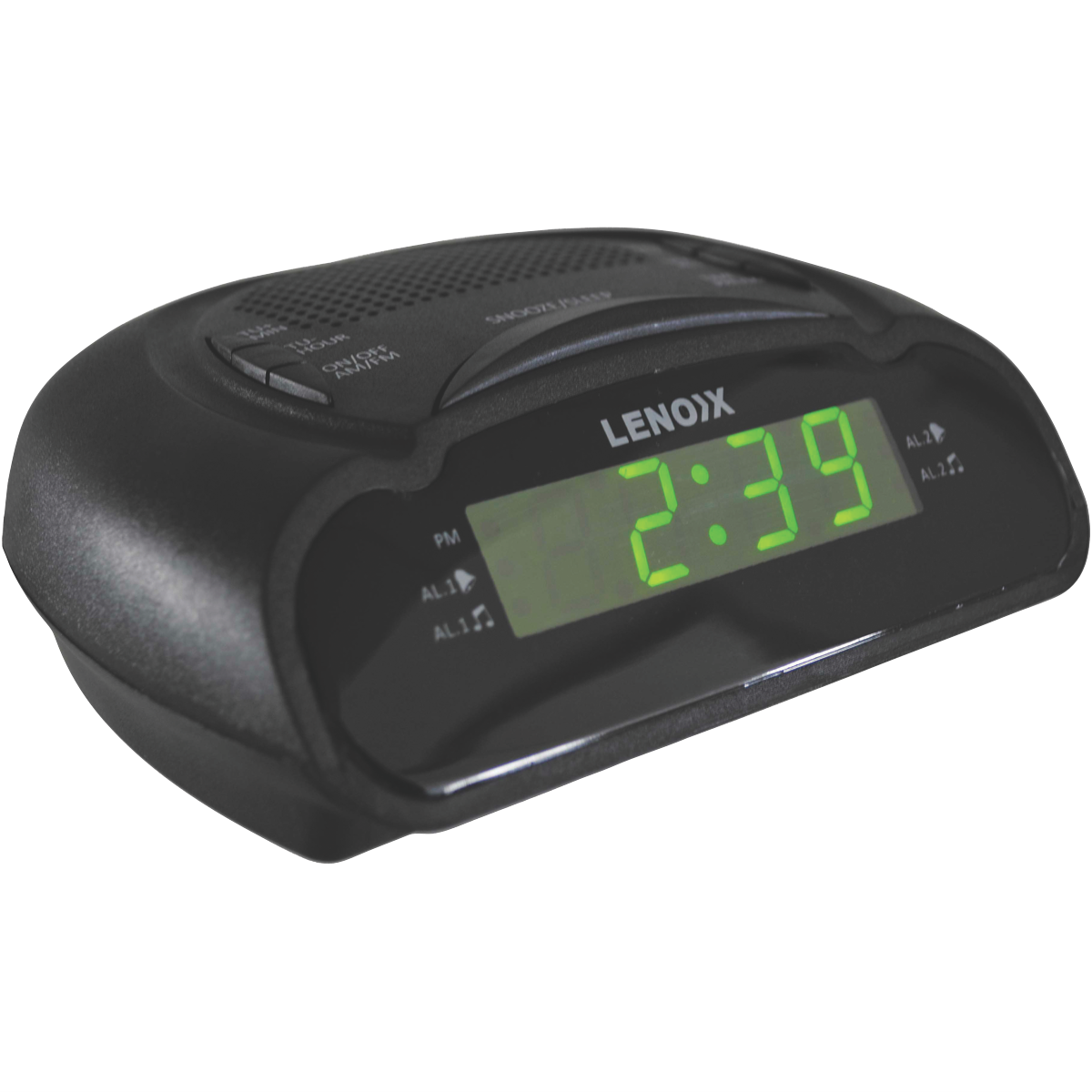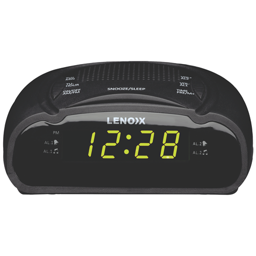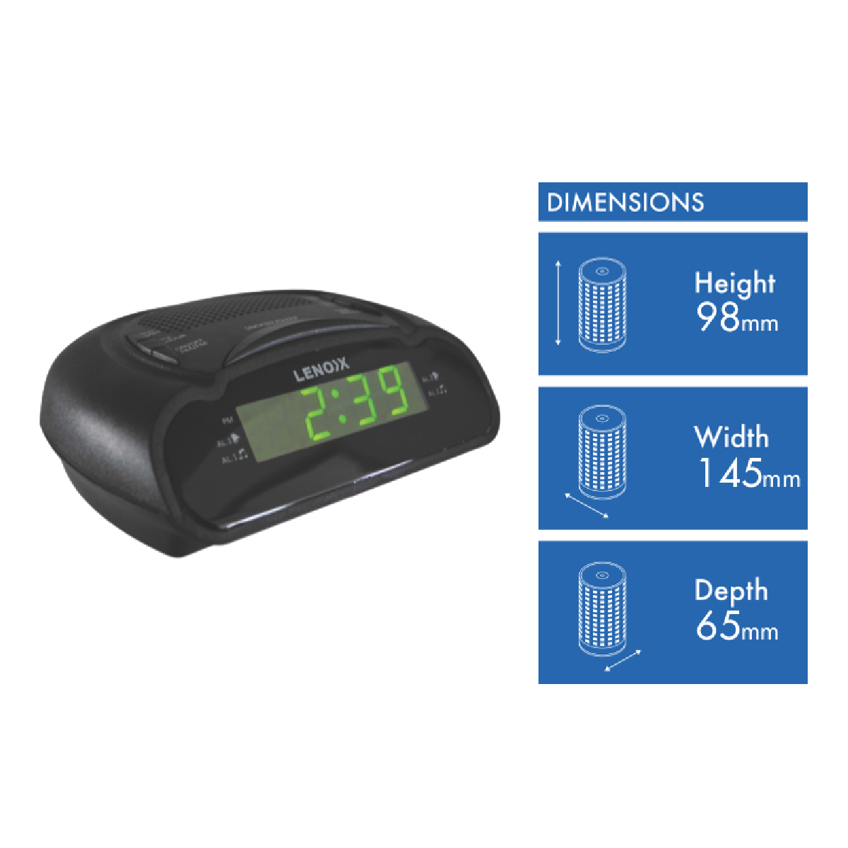 Wake up refreshed and on time with the sleek new Lenoxx Clock Radio AM/FM. This compact clock radio packs powerful sound and customizable alarms into a modern black design that looks great on any nightstand. With 300mW of total output the Lenoxx fills your bedroom with crisp clear audio from the AM and FM radio stations. Save your favorite stations as presets for quick tuning access. Set the dual alarms to wake you up to the radio or buzzer. The large LED display illuminates the time in green light. Snooze lets you catch a few more minutes of sleep before starting your day. The Lenoxx Clock Radio AM/FM runs on 2 AAA batteries (not included) for cordless convenience. Weighing just 0.264kg it measures 65mm high 145mm wide and 98mm deep for a nightstand-friendly footprint. Enjoy AM frequencies from 540 to 1600KHz and FM from 88 to 108MHz. With one year warranty from the manufacturer this clock radio delivers reliable performance. The manufacturer's part number for this product is CR21. Give yourself the gift of an effortless morning routine with the Lenoxx Clock Radio AM/FM.