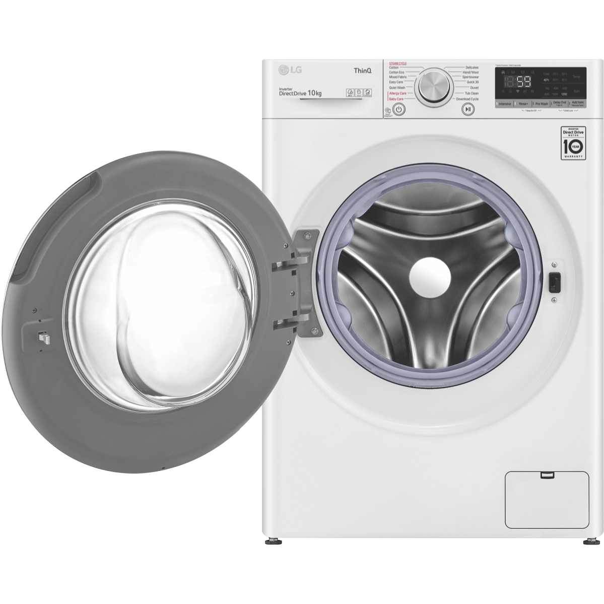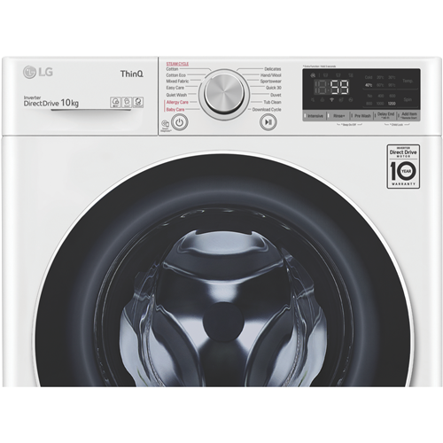 Ease your laundry days with the LG 10kg Front Load Washer. This white front loader makes washing simple and efficient handling loads up to 10kg with its range of 12 programs. The Cotton and Cotton Eco cycles tackle your regular washes while the Allergy Care program sanitizes for sensitive skin. Spin your laundry up to a quick 1400rpm to reduce drying time. The A.I. Direct Drive motor provides powerful and quiet performance. Steam technology penetrates deep to remove stains. Remotely start and monitor your wash via the LG ThinQ app. Use the delay start to schedule washing when it suits you. This washer is WELS 4.5 star water rated for efficiency using just 86 litres per wash. It also has a 4.5 star energy rating to save on running costs. With a width of 600mm height of 850mm and depth of 620mm the LG 10kg Front Loader fits most laundry spaces. LG provides a 2 year warranty for peace of mind. The manufacturer's part number for this product is WV5-1410W. Invest in this feature-packed front loading washing machine from LG for easy and effective laundry.