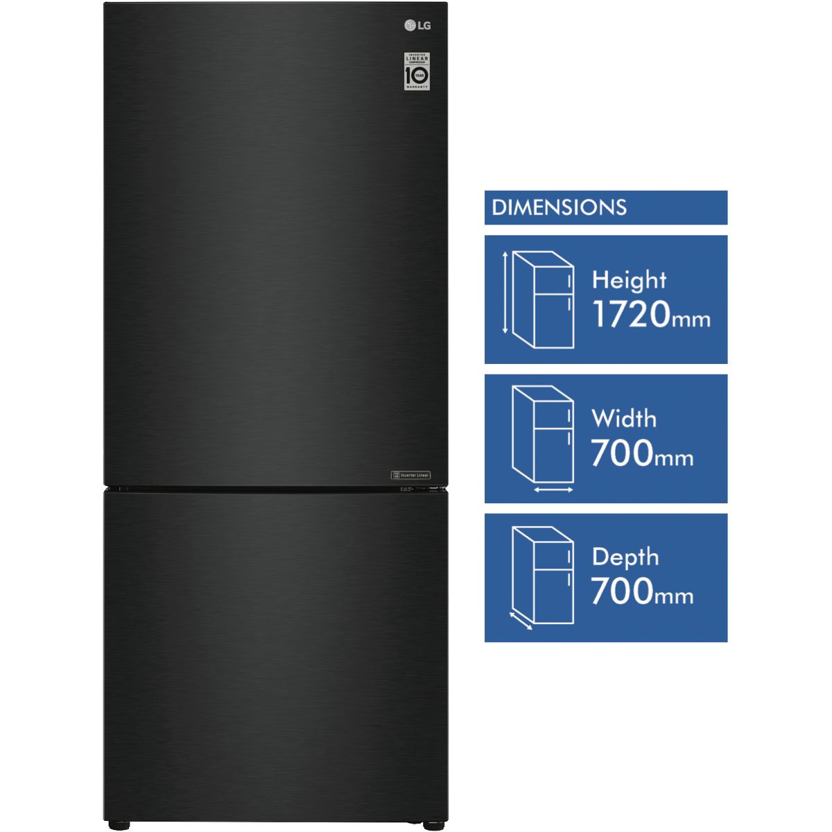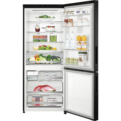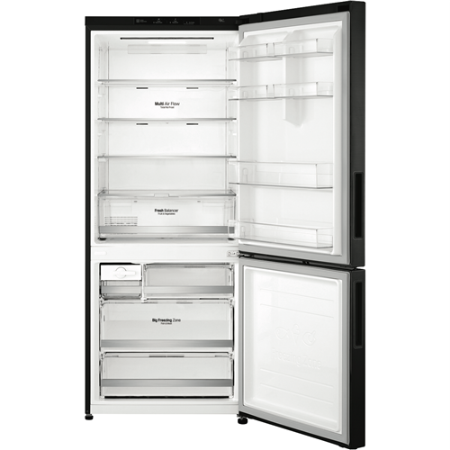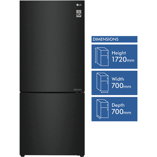Discover the spacious elegance of the LG 420L Bottom Mount Refrigerator. This stylish and modern fridge boasts a generous 420 litre total capacity featuring a 287 litre fridge and 133 litre freezer making it perfect for families and those who love to entertain. The sleek matte black finish and right hand door opening add to its sophisticated aesthetic. Thanks to its bottom mount design you'll enjoy convenient access to frequently used fresh foods in the fridge while frozen items are tucked neatly away below. Maintain the ideal temperature and moisture levels with clever features like Door Cooling and a Moisture Balance Crisper. Adjustable shelving and a Folding Shelf provide flexible storage options. Rated an impressive 5 stars for energy efficiency this fridge helps lower your power bills while still delivering outstanding cooling performance. With a 2 year manufacturer's warranty you can enjoy the quality and reliability that comes with LG. The manufacturer's part number for this product is GB-455MBL. See how the 420L Bottom Mount Refrigerator can bring stylish spacious and efficient refrigeration to your home today.