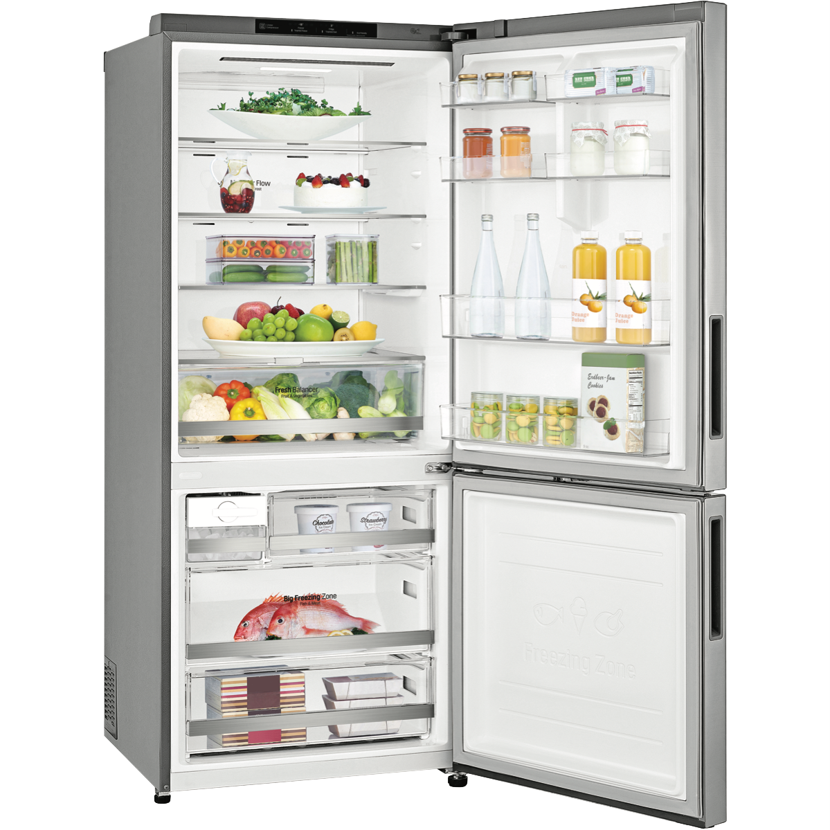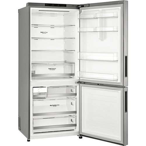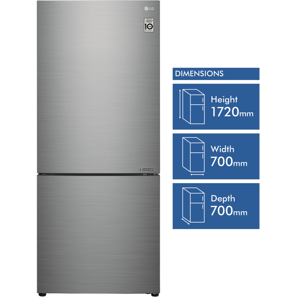 Bring home convenient and spacious refrigeration with the LG 420L Bottom Mount Refrigerator. This bottom mount fridge comes with a generous 420 litre total capacity - 287 litres in the fridge and 133 litres in the freezer. The right hinge door is reversible for flexible installation while the clean silver finish and stainless steel supplier finish lend a modern look. Smart features like Door Cooling Folding Shelf and Moisture Balance Crisper help you store all your fresh and frozen foods easily. With its energy efficient 5 star rating this fridge strives to cut your electricity bills. The dimensions are 700mm (W) x 1720mm (H) x 700mm (D). LG provides a 2 year warranty for additional peace of mind. The manufacturer's part number for this product is GB-455PL. Bring home the convenience of spacious refrigeration with the LG 420L Bottom Mount Fridge today.