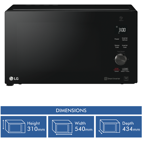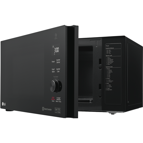 Additional Features Faster Cooking 1200W Power, LG Inverter Technology Evenly Heats or Defrosts Food, Tempered Glass Front Door With Hidden Handle, Anti-Bacterial Easy Clean Coating, LED Lighting, Child Lock