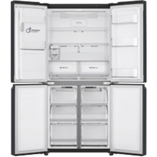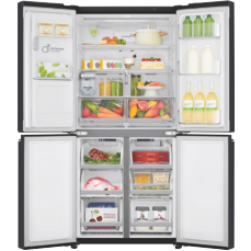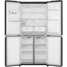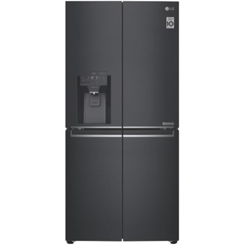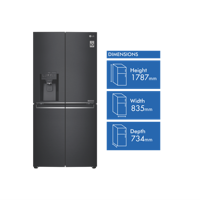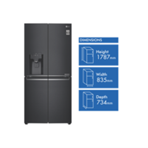 This matte black LG French Door fridge GF-L570MBL has been designed in a slim fit to accommodate an 85cm wide alcove. It has a 506 litre total capacity to suit a 3-4 person household including a non-plumbed ice maker cleverly designed into the door to free up the top shelf for loading up without restriction. Reach for everyday essentials plus fresh produce and drinks with ease with wide shelves and storage baskets within the fridge and freezer to keep a kitchen calm and organised. This LG fridge has a non-plumbed water dispenser for your everyday convenience a Pure N Fresh air purification system to minimise food odours and a quiet and durable Inverter Linear Compressor with fewer moving parts and reduced vibration. Enjoy the ultimate in kitchen style with its fingerprint resistant premium matte black coating. It has a 3 Star Energy Rating. Built-in Wi-Fi allows you to adjust settings remotely so your fridge and freezer can accommodate a large unexpected grocery shop before you get home with the downloadable Smart ThinQ app on your compatible Android or iOS smartphone. Access what you need fast with the ever-so-stylish black Slim French Door fridge from LG.