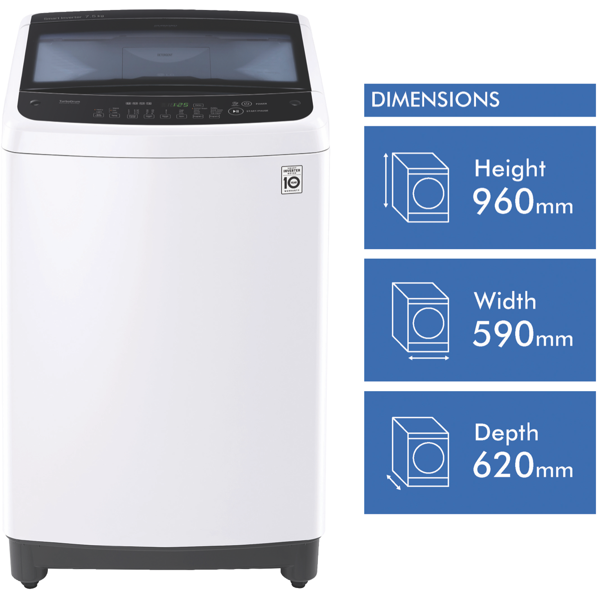 Discover the perfect laundry companion with the LG 7.5kg Top Load Washer. With a generous 7.5kg washing capacity this top loader makes light work of the weekly wash for medium to large households. The sleek white finish will blend seamlessly into any modern laundry while the durable build promises years of reliable service. The Eco Cotton program helps you wash clothes efficiently using less water and energy. The Smart Inverter Control provides quiet washing by optimizing rotations for the selected wash program. The wide glass lid lets you view the wash cycle easily. Inside the TurboDrum improves wash performance through enhanced drum rotations. With handy features like Delay Start this washer lets you schedule washing to suit your routine. The LG top loader is also designed for convenience. Programs like Quick Wash help finish laundry fast when time is limited. The easy 3 second press on the water level gives you control over the wash. With both hot and cold wash options plus a choice of 8 versatile programs you can customize each load. Rinse and spin settings also allow flexibility.Simply load select your settings and let the washer handle the hard work while you get on with your day. With a 3 star WELS water rating and 3 star energy rating the LG 7.5kg Top Loader makes an eco-friendly family-sized addition to any laundry. The manufacturer's part number for this product is WTG7520. Check out the LG Top Load Washer for an effortless wash day experience.