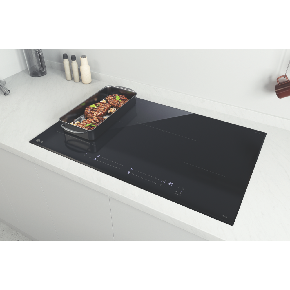 Revolutionize your cooking with the LG 80cm Induction Cooktop BCI807T4BG. This sleek black ceramic glass cooktop boasts four powerful induction zones that heat quickly and precisely giving you ultimate control over your culinary creations. With 15 power levels and a handy power boost function you can effortlessly tackle any recipe from a gentle simmer to a rapid boil. The intuitive touch controls and cook timer make operation a breeze while the stop & go function lets you pause cooking when needed. Safety is paramount with residual heat indicators child safety lock and automatic safety switch off for your peace of mind. Monitoring is made easy with the innovative ThinQ(Wi-Fi) functions and you can even pair it with your hood for seamless operation. Measuring 800mm wide 520mm deep and 48mm high this cooktop is designed to fit beautifully into your kitchen. Plus enjoy a 2 year manufacturer's warranty for added assurance. Elevate your cooking game with the LG 80cm Induction Cooktop BCI807T4BG. Model number BCI807T4BG.