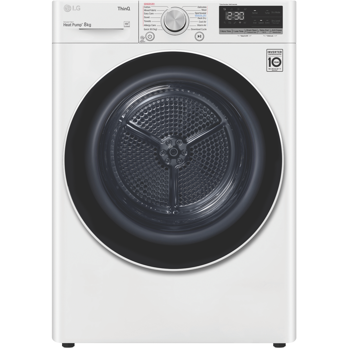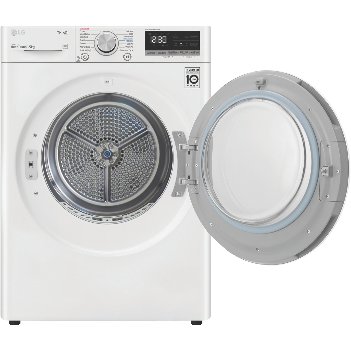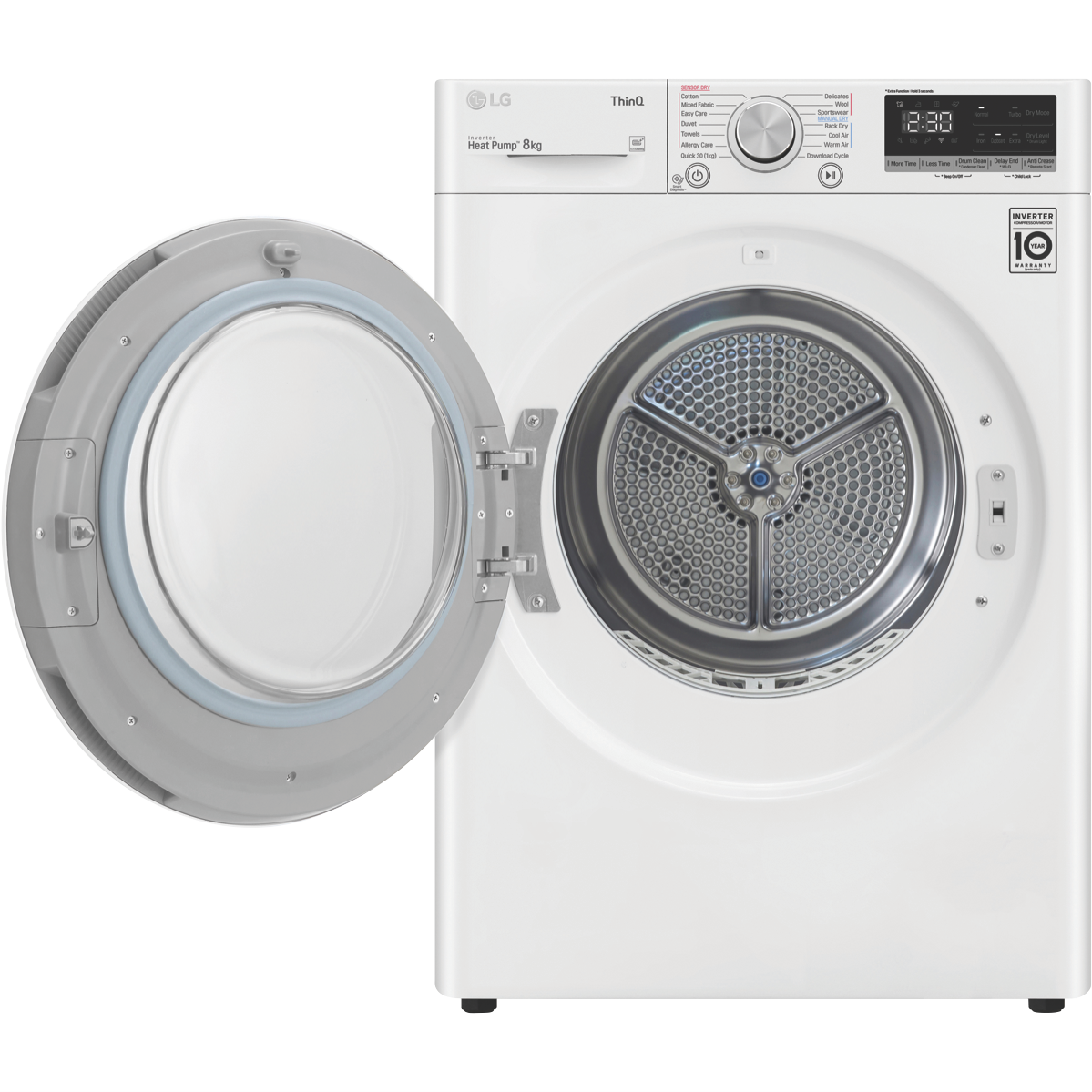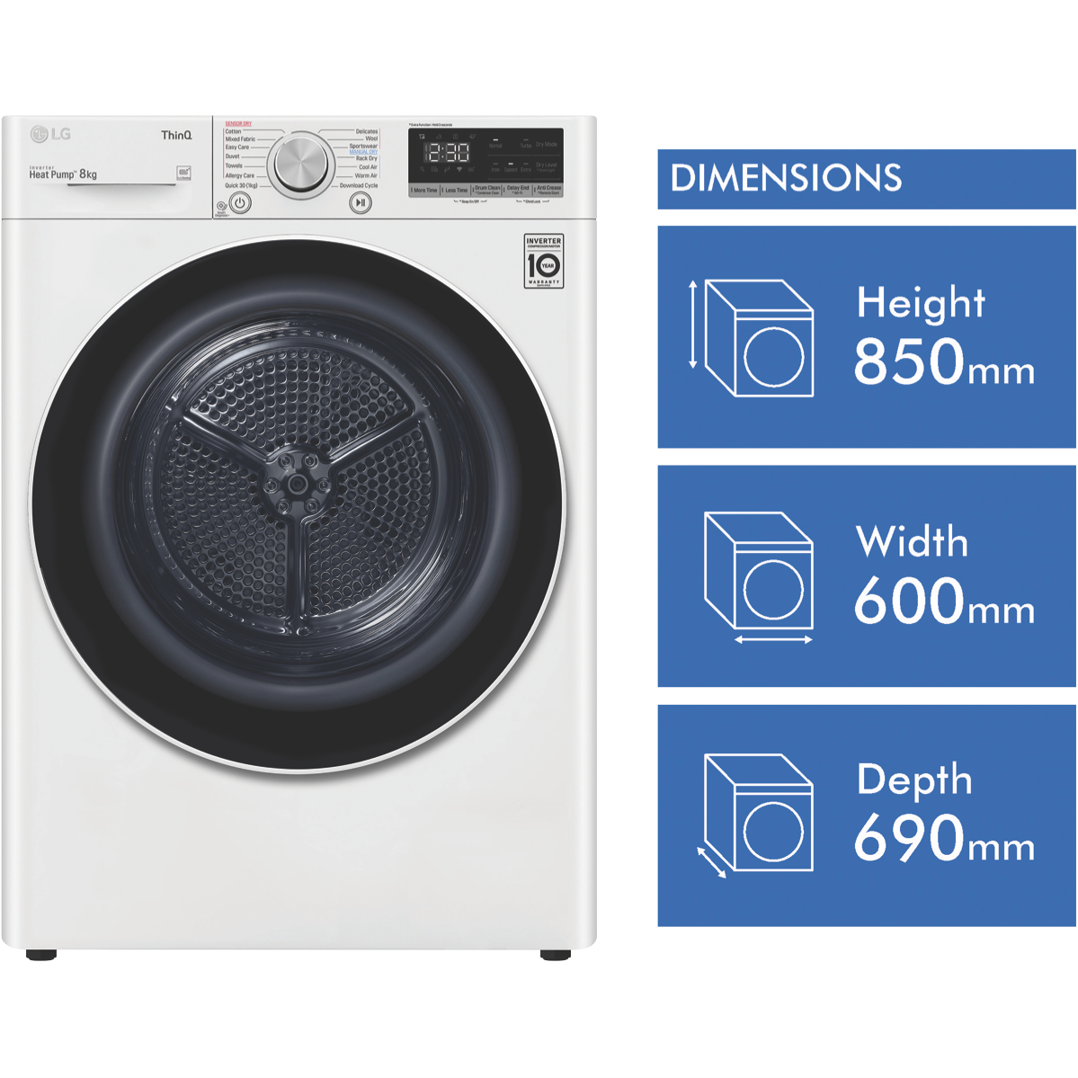 Equipped with LG's Inverter Compressor and heat pump technology to make a Super-Efficient 9 Star Energy Rating possible this LG Heat Pump Dryer DVH5-08W offers both energy savings and optimal care of clothing in an 8kg capacity stainless steel drum. A heat pump dryer dries fabrics carefully and efficiently and does not require venting to the outside so they're perfect if you're renting. This LG dryer is designed to care for what you wear with Sensor Dry cycles including Allergy Care Easy Care Wool or Delicates for dedicated fabric treatment with no overdrying. Select a Time Dry cycle like Rack Dry in conjunction with the included Drying Rack for drying off wet hats scarves or shoes. Its clever Auto Cleaning Condenser removes lint and dirt with its automatic condenser clean function; ensuring your dryer runs both optimally and hygienically. Plus with LG ThinQ with Smart Pairing* this LG heat pump dryer automatically sets the best dry cycle based on the last wash in your connected LG front load washer. It is 850mm high 600mm wide and 690mm deep so take careful measurements of where your dryer needs to fit leaving enough room for the door to open. *Compatible smartphone required Android 4.1.2 (JellyBean) or later or iOS 9 or later required for LG ThinQ application.
