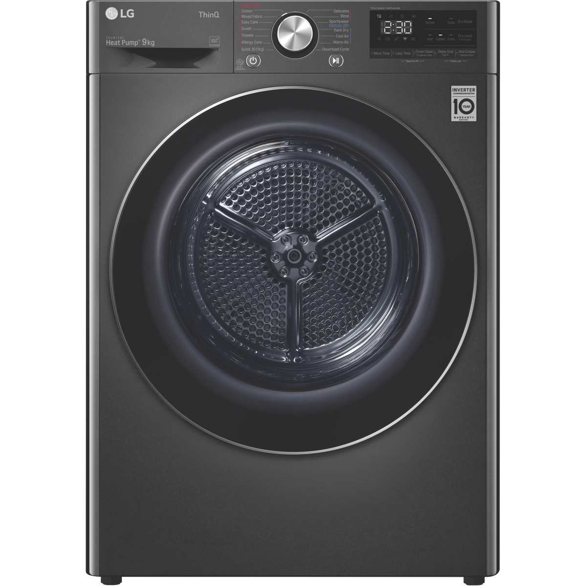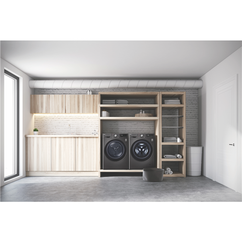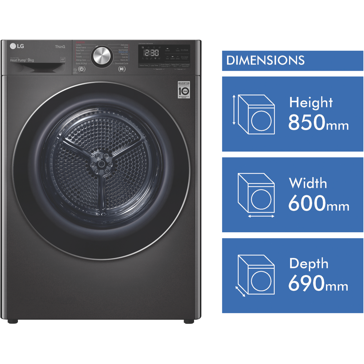 Equipped with LG's Inverter Compressor and heat pump technology to make a Super-Efficient 9 Star Energy Rating possible this LG Heat Pump Dryer DVH9-09B offers both energy savings and optimal care of clothing in a 9kg capacity stainless steel drum. A heat pump dryer dries fabrics carefully and efficiently and does not require venting to the outside so they're perfect if you're renting. This LG dryer is designed to care for what you wear with Sensor Dry cycles including Allergy Care Easy Care Wool or Delicates for dedicated fabric treatment with no overdrying. Select a Time Dry cycle like Rack Dry in conjunction with the included Drying Rack for drying off wet hats scarves or shoes. Its clever Auto Cleaning Condenser removes lint and dirt with its automatic condenser clean function; ensuring your dryer runs both optimally and hygienically. Plus with LG ThinQ with Smart Pairing* this LG heat pump dryer automatically sets the best dry cycle based on the last wash in your connected LG front load washer. It is 850mm high 600mm wide and 690mm deep so take careful measurements of where your dryer needs to fit leaving enough room for the door to open. *Compatible smartphone required Android 4.1.2 (JellyBean) or later or iOS 9 or later required for LG ThinQ application.