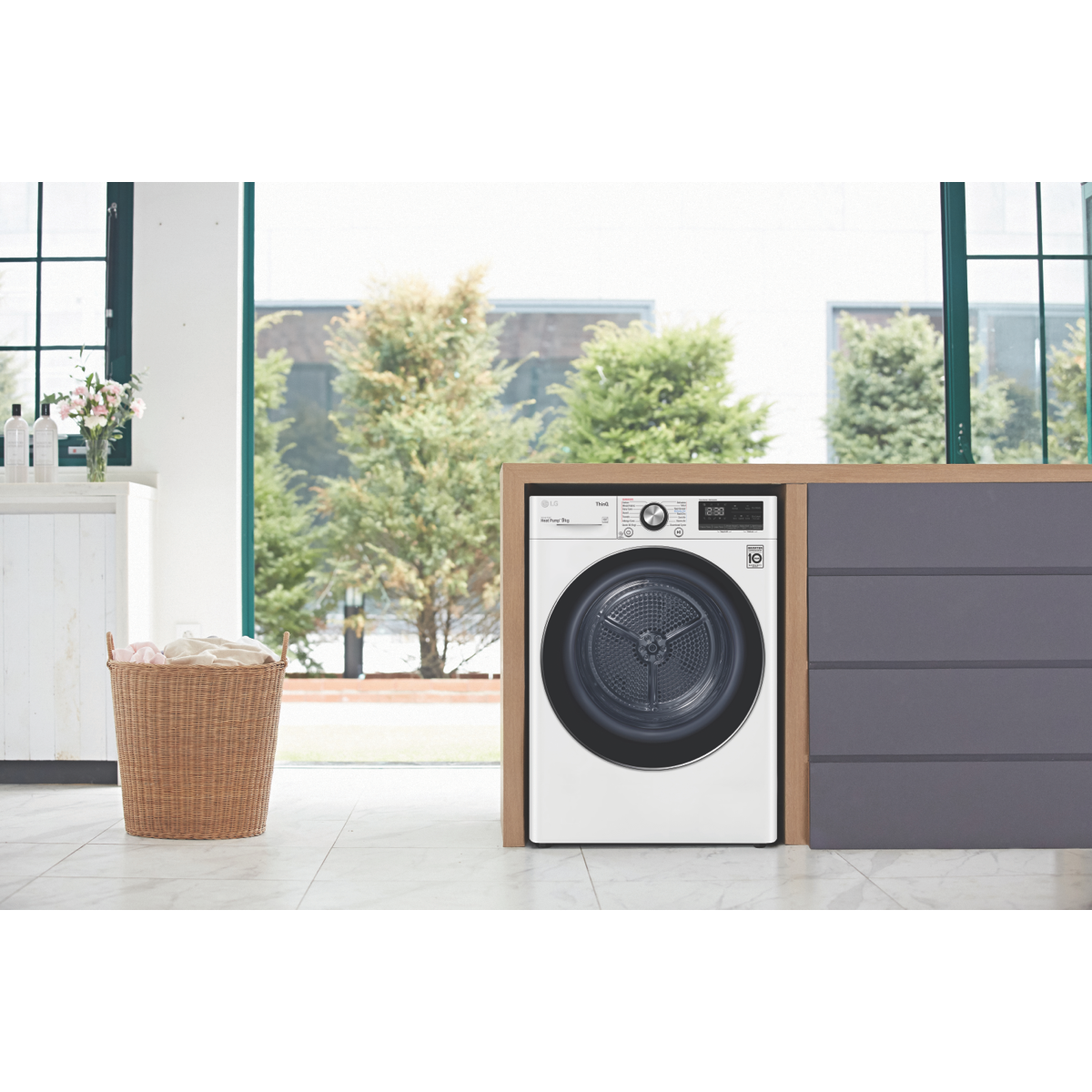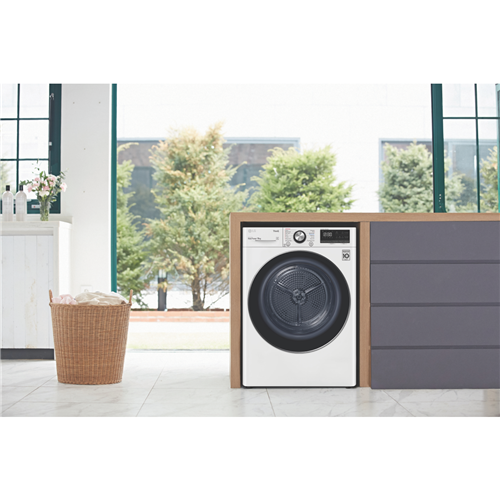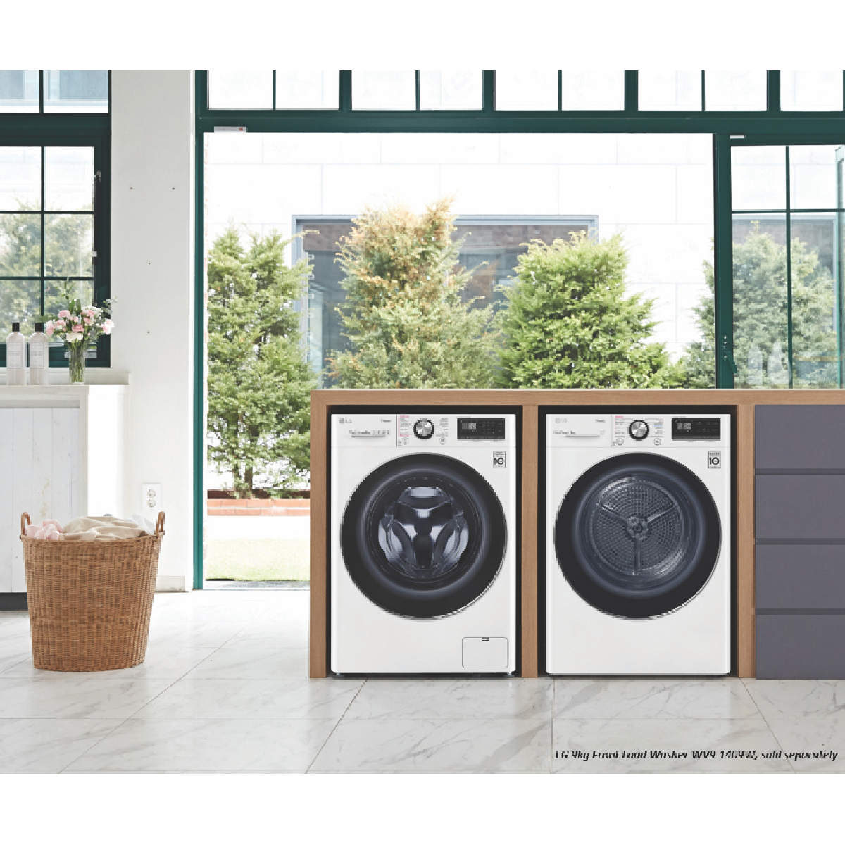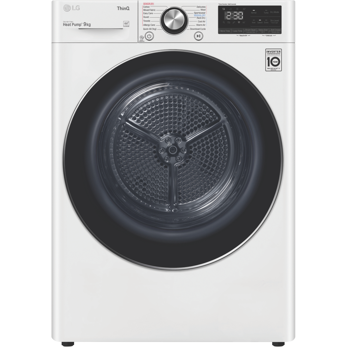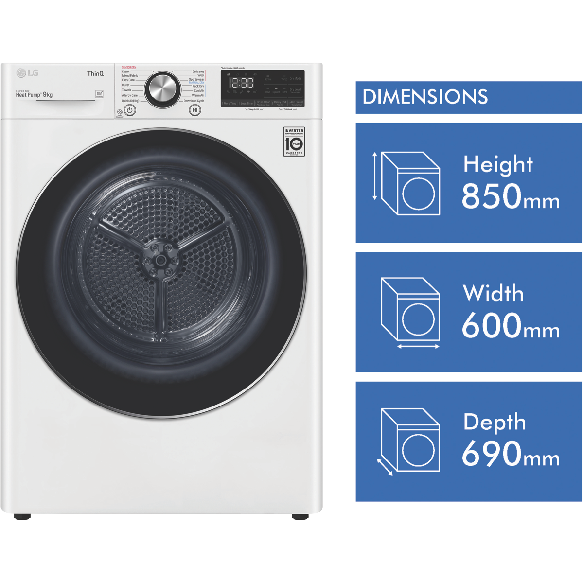 Equipped with LG's Inverter Compressor and heat pump technology to make a Super-Efficient 9 Star Energy Rating possible this LG Heat Pump Dryer DVH9-09W offers both energy savings and optimal care of clothing in a 9kg capacity stainless steel drum. A heat pump dryer dries fabrics carefully and efficiently and does not require venting to the outside so they're perfect if you're renting. This LG dryer is designed to care for what you wear with Sensor Dry cycles including Allergy Care Easy Care Wool or Delicates for dedicated fabric treatment with no overdrying. Select a Time Dry cycle like Rack Dry in conjunction with the included Drying Rack for drying off wet hats scarves or shoes. Its clever Auto Cleaning Condenser removes lint and dirt with its automatic condenser clean function; ensuring your dryer runs both optimally and hygienically. Plus with LG ThinQ with Smart Pairing* this LG heat pump dryer automatically sets the best dry cycle based on the last wash in your connected LG front load washer. It is 850mm high 600mm wide and 690mm deep so take careful measurements of where your dryer needs to fit leaving enough room for the door to open. *Compatible smartphone required Android 4.1.2 (JellyBean) or later or iOS 9 or later required for LG ThinQ application.