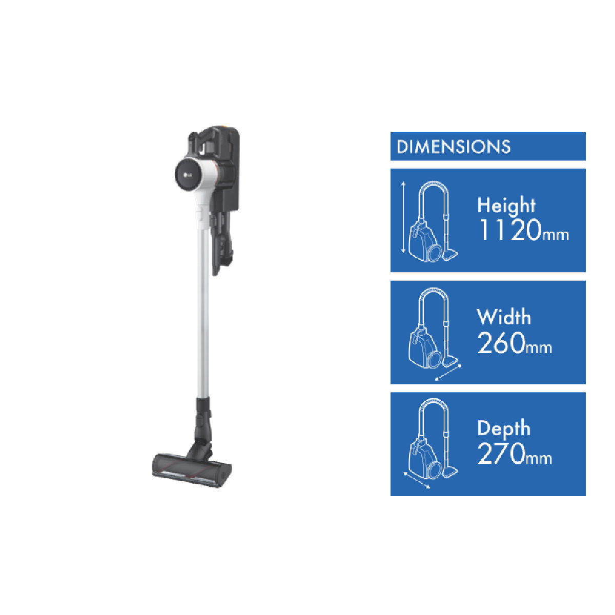 The LG A9 CordZero Stick Vacuum is a lightweight and versatile cleaning solution for all floor types. Designed with convenience in mind this stick vacuum features a cordless design for easy maneuverability around the home while providing powerful suction to lift dirt and dust from carpets and hard floors. Packing up to 480W of power into its sleek white frame the A9 makes short work of daily dirt and debris with its multi-surface power drive nozzle. The 0.44L dustbin capacity and lithium-ion battery delivering up to 50 minutes of runtime ensure you can cover more cleaning between emptying and charging. Weighing just 2.38kg the compact A9 is easy to carry up and down stairs or from room to room. And with a 4-hour charge time this vacuum is always ready when messes strike. From hardwood to tile short pile to plush carpet the A9 has the versatility to handle it all. The manufacturer's part number for this product is A9N-SOLO. Bring home the cleaning performance and freedom of the LG A9 CordZero today.