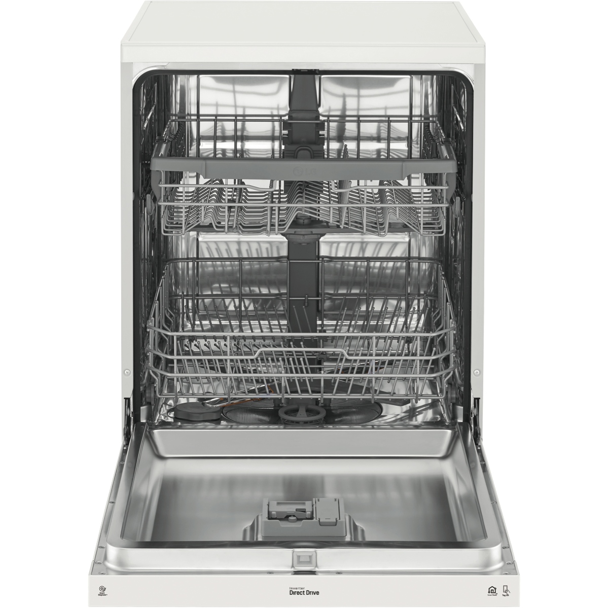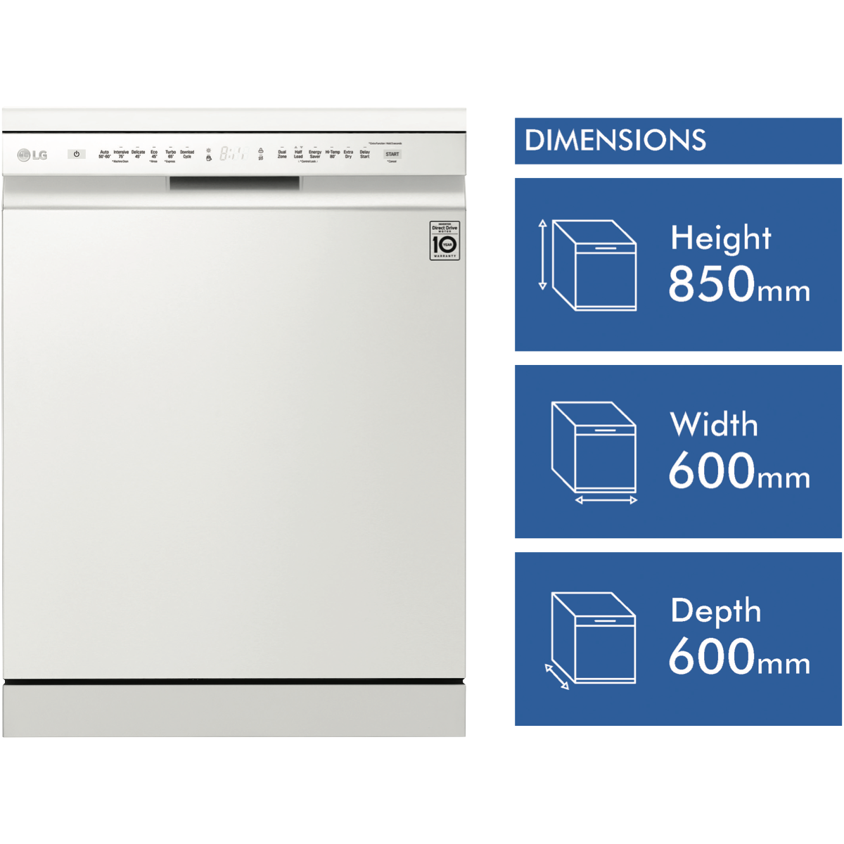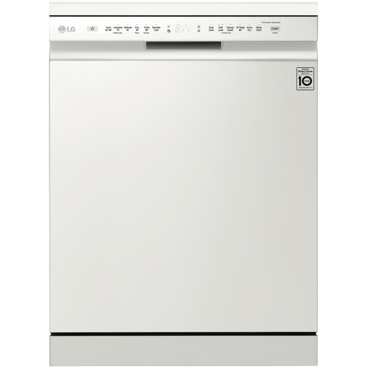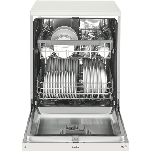 Wash up quick with the LG QuadWash White Dishwasher XD5B14WH. A minimalist exterior couples with a subtle micro LED display to create a statement most dishwashers can't match. Clean from multiple angles thanks to QuadWash's four rotating blades including two oscillating nozzles that pulse and deliver water thoroughly. Select Turbo Cycle to wash light or moderately dirty dishes in 59 minutes(1). LG's own Direct Drive Motor is made with less moving parts for reliable and quiet cleaning and is also backed by a 10 Year Warranty(2). Choose Dual Zone Wash to lightly clean delicate dishes and heavily scrub dirty pots and pans during the same wash. Load the dishes your way with folding tines an adjustable height upper rack and the Glide Rail making drop off and pickup smooth no matter how heavy the load is. Disclaimers: (1) Reduced load size (maximum 10 place settings) required. Cycle is Wash only. (2) 2 years parts and labour plus 8 years on motor (parts only).