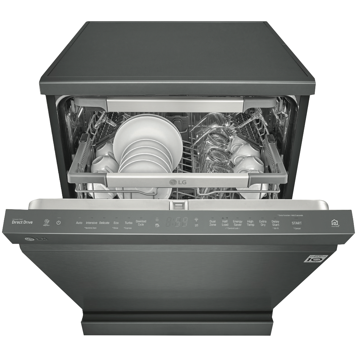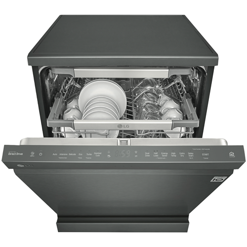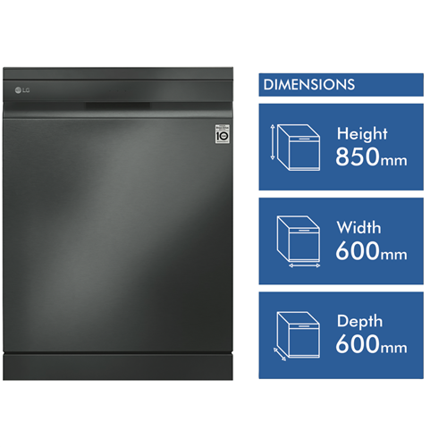 This QuadWash Matte Black Stainless Steel Dishwasher XD3A15MB offers excellent cleaning results and stacking flexibility in a stunning minimalist design. Wash plenty of plates cups glasses and serving dishes with its 15-place setting capacity and load it all your way with the SmartRack Plus system featuring folding tines to lay pots and pans down flat plus height adjustable racking to fit more inside. It uses just 11.1 litres of water per wash cycle thanks to the LG QuadWash bottom spray arm mechanism with four rotating blades and oscillating nozzles that spurt out water at multiple angles to get the job done at once using fewer resources. It has a 5.5 Star WELS Water Rating and a 4 Star Energy Rating. Choose from seven cleaning programs for all types of jobs including Auto for all soil levels Intensive for baked-on foods or Turbo to get a small load of lightly soiled dishes cleaned in around 59 minutes(1). This LG dishwasher features a Dual Zone Wash option to carefully clean glasses and cups in the upper basket while a higher spray intensity gets to work on grubby pots and bakeware in the bottom basket. Plus with built-in Wi-Fi you can use the LG SmartThinQ app(2) on your compatible smartphone to download additional programs troubleshoot or receive notifications. Disclaimers: (1) Reduced load size (maximum 10 place settings) required. Cycle is Wash only. (2) Compatible smartphone required Android 4.1.2 (JellyBean) or later or iOS 9 or later required for LG ThinQ application.