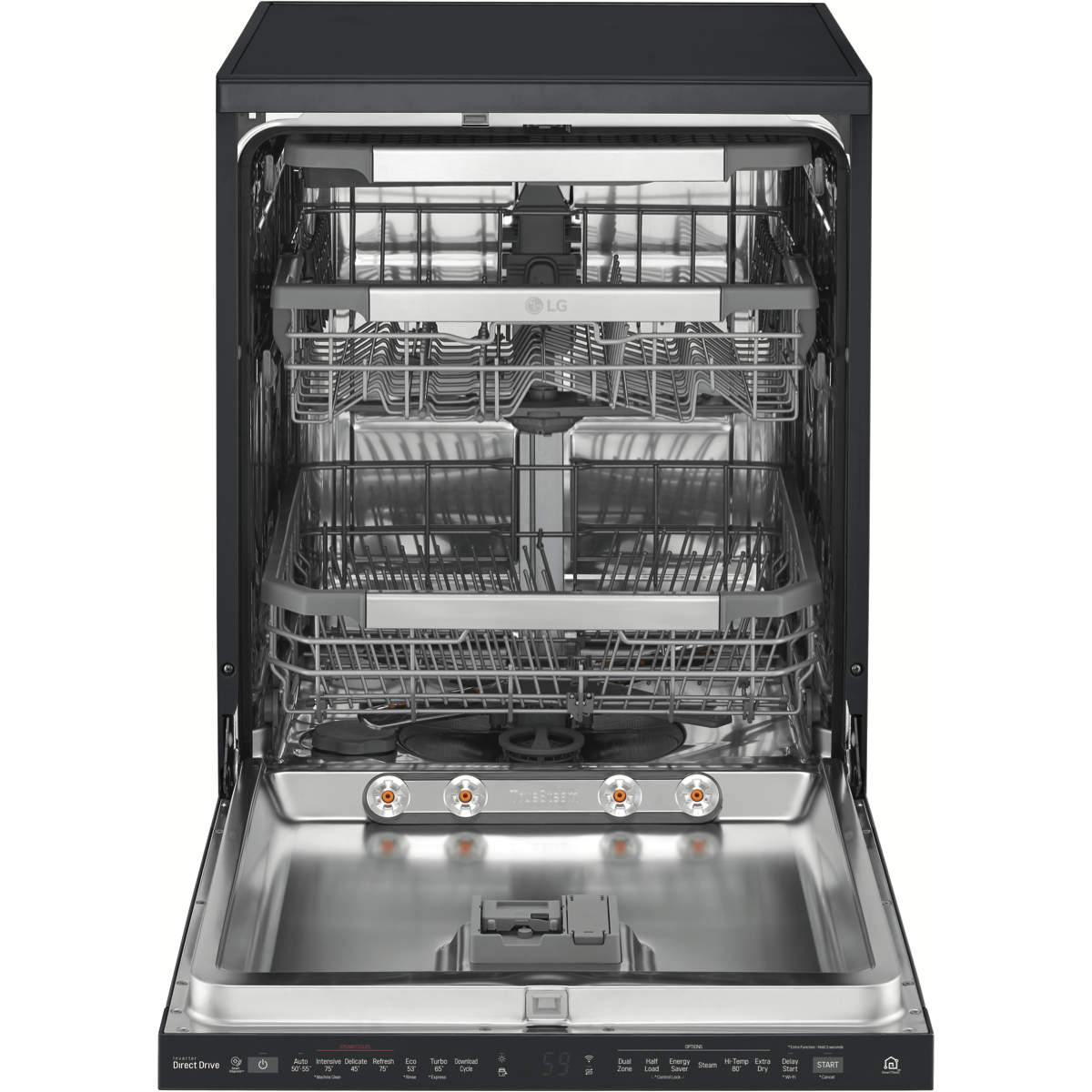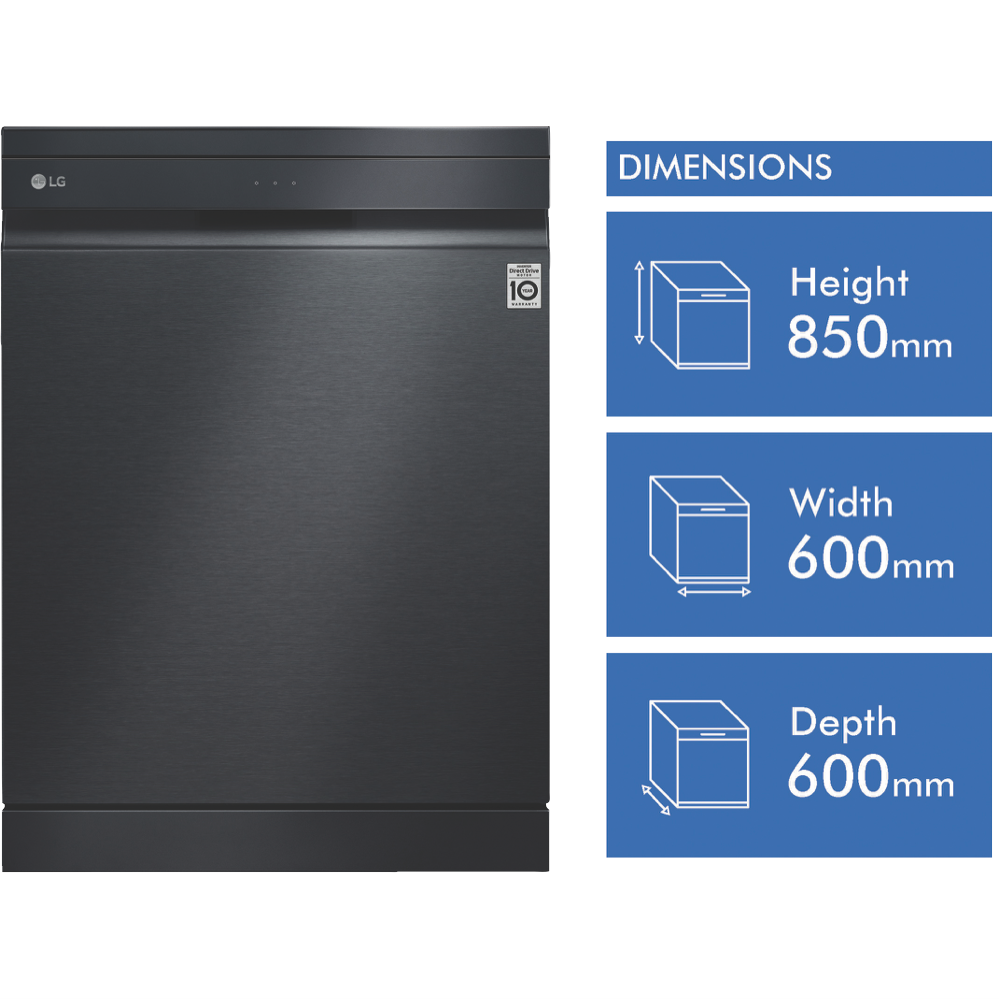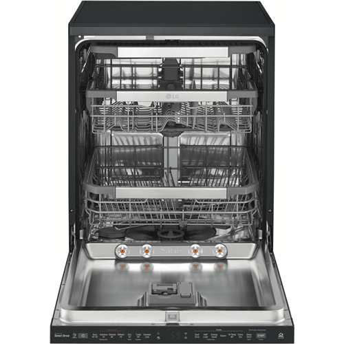 With TrueSteam technology this LG QuadWash Matte Black TrueSteam Dishwasher XD3A25MB uses the power of steam to remove up to 99.999% bacteria(1) and stubborn food scraps from your dishes ensuring they come out dry and sparkling clean. This LG dishwasher offers a thorough wash thanks to its bottom spray arm mechanism that features four rotation blades two of which spray jets of water from multiple angles for a deep powerful clean. With this dishwasher's Direct Drive Motor there are less moving parts inside so you can put a load on without creating too much background noise perfect for those who live in smaller houses. It has a Dual Zone Wash option to carefully clean glasses and cups in the upper basket while a higher spray intensity gets to work on grubby pots and bakeware in the bottom basket. Even heavier loads smoothly enter and exit with the Glide Rail. Plus with built-in Wi-Fi you can use the LG SmartThinQ app(2) on your compatible smartphone to download additional programs troubleshoot or receive notifications. Disclaimer: (1) E.coli Listeria & Salmonella bacteria reduction tested using Eco cycle with High Temp and Steam options. (2) Compatible smartphone required Android 4.1.2 (JellyBean) or later or iOS 9 or later required for LG ThinQ application.