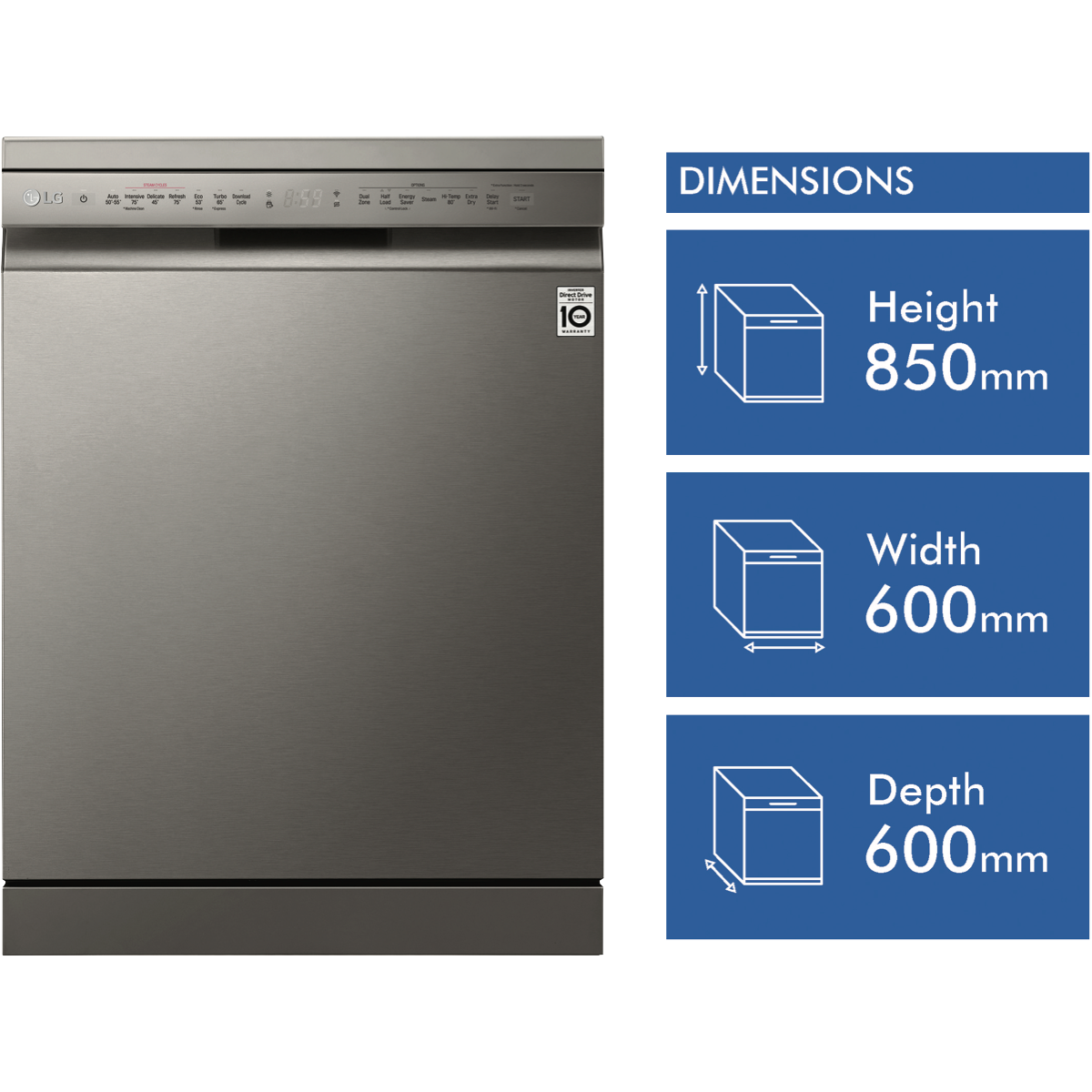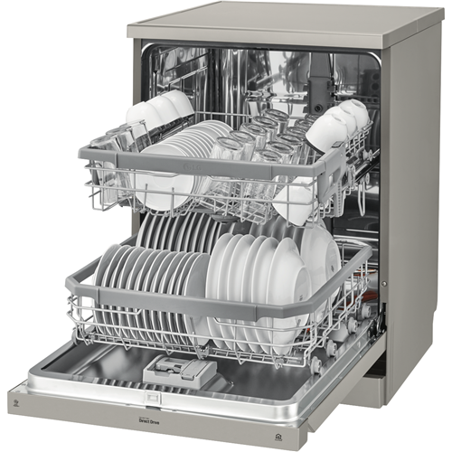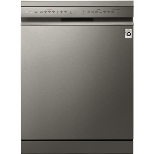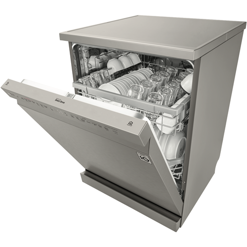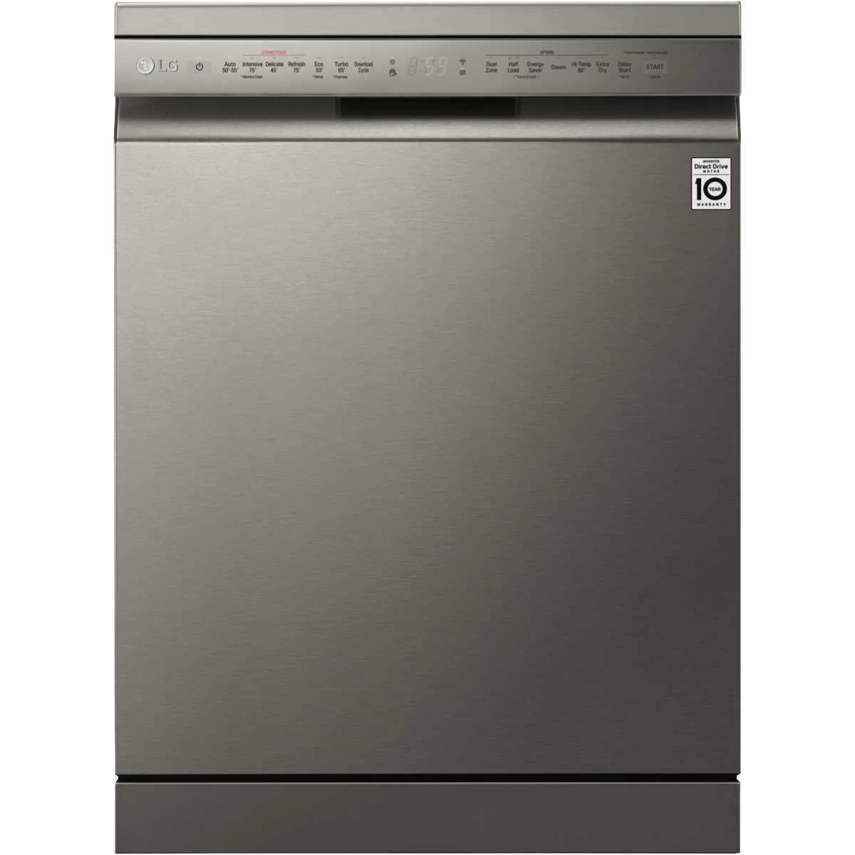 With TrueSteam technology this LG QuadWash Platinum Steel TrueSteam Dishwasher XD4B24PS uses the power of steam to remove up to 99.999% bacteria(1) and stubborn food scraps from your dishes ensuring they come out dry and sparkling clean. This LG dishwasher offers a thorough wash thanks to its bottom spray arm mechanism that features four rotation blades two of which spray jets of water from multiple angles for a deep powerful clean. With this dishwasher's Direct Drive Motor there are less moving parts inside so you can put a load on without creating too much background noise perfect for those who live in smaller houses. It has a Dual Zone Wash option to carefully clean glasses and cups in the upper basket while a higher spray intensity gets to work on grubby pots and bakeware in the bottom basket. Even heavier loads smoothly enter and exit with the Glide Rail. Plus with built-in Wi-Fi you can use the LG SmartThinQ app(2) on your compatible smartphone to download additional programs troubleshoot or receive notifications. Disclaimer: (1) E.coli Listeria & Salmonella bacteria reduction tested using Eco cycle with High Temp and Steam options. (2) Compatible smartphone required Android 4.1.2 (JellyBean) or later or iOS 9 or later required for LG ThinQ application.