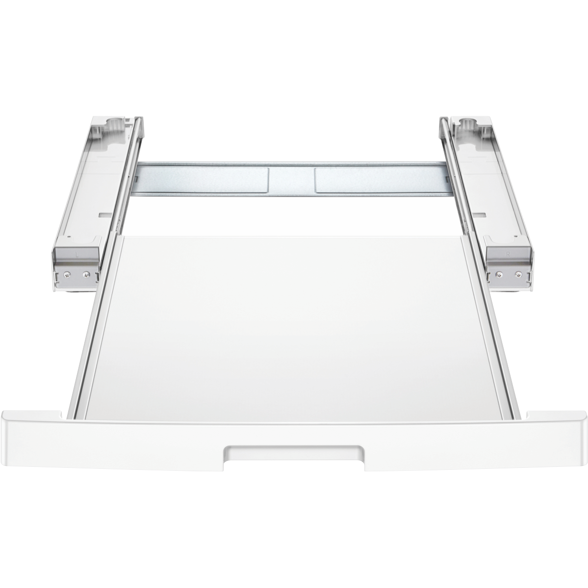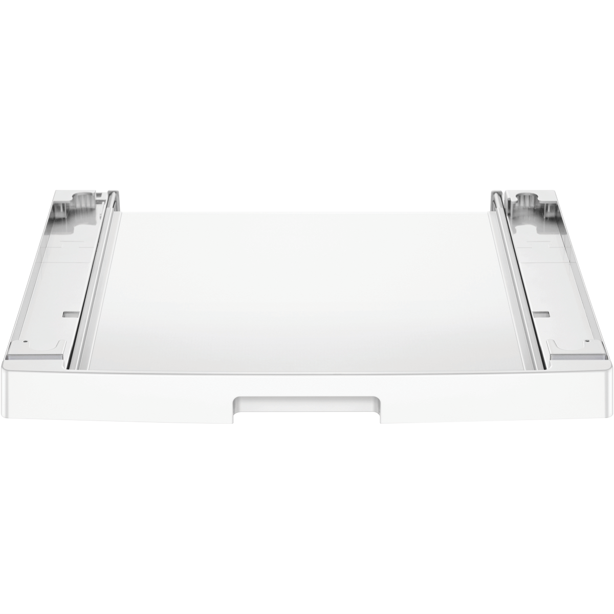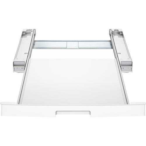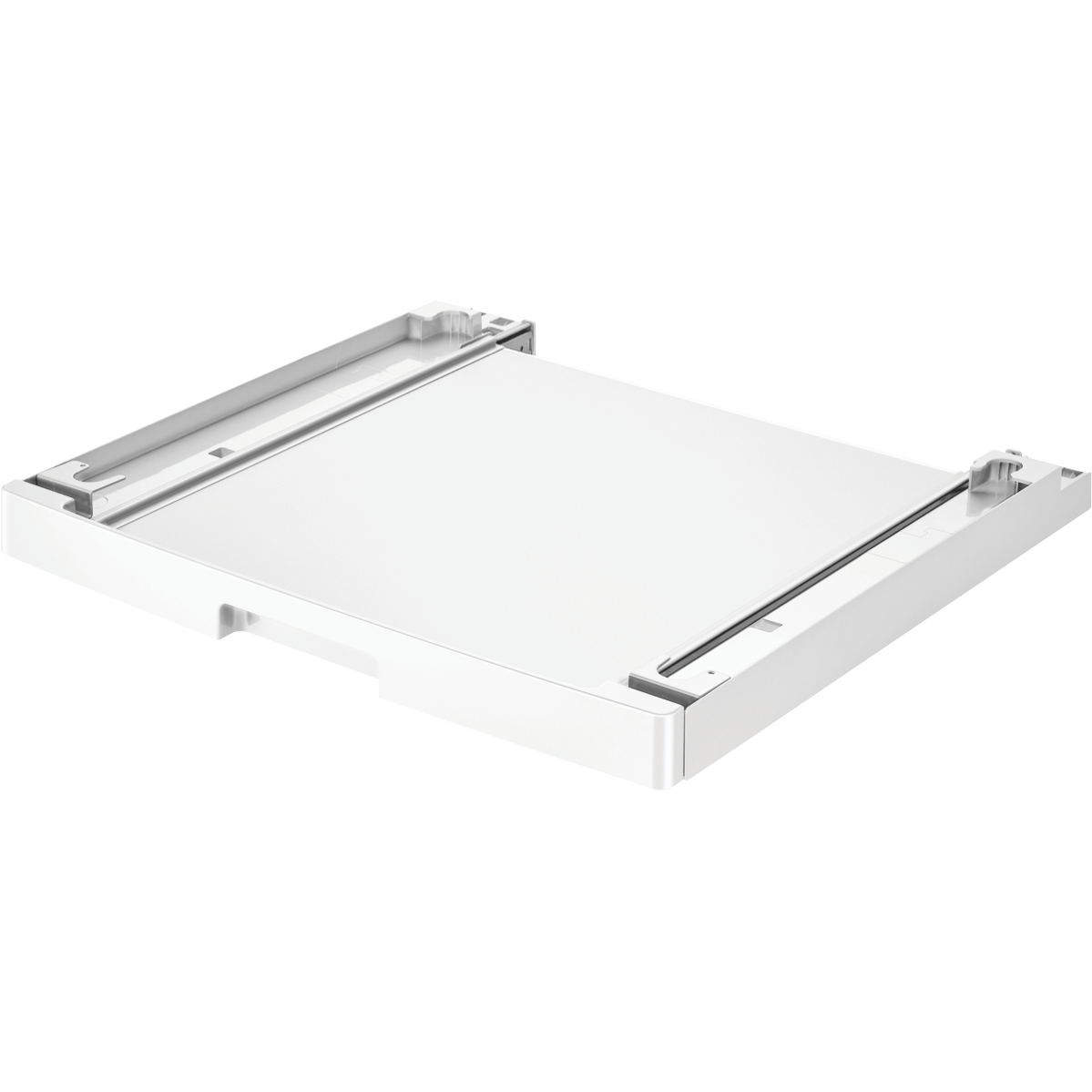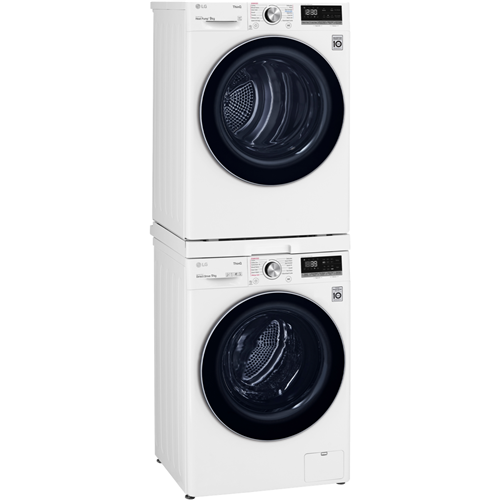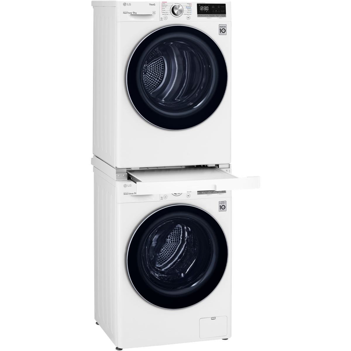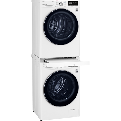 Enjoy the convenience of stacking your LG washing machine and dryer together with the LG Stacking Kit in white. This stacking kit allows you to perfectly align your LG front load washer and dryer for a streamlined look. With models like the WV10-1410W WV6-1409W WV5-1408W and DVH10-10W now able to be stacked you can save floor space without sacrificing functionality. The kit includes a convenient pull out shelf for laundry sorting and storage between cycles. Measuring 600mm wide by 590mm deep by 65mm high this stacking kit maximizes your laundry configuration possibilities. Give your laundry area a polished look that makes doing the wash simple and efficient. The manufacturer's part number for this product is STKIT-WH. Take advantage of the stacking capabilities of your LG washer and dryer with this easy to install white stacking kit.