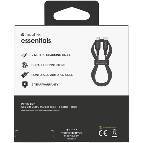 Need an on-the-go charging solution for your USB-C devices? Look no further than the Mophie Essential USB-C-C Cable. With a total system power of 60W this 2-metre braided cable provides the power you need to quickly juice up smartphones tablets and laptops. The durable USB Type-C connectors ensure a secure long-lasting connection while the nylon-braided exterior protects against fraying and tangling. Charge with confidence thanks to the 24 month manufacturer's warranty. The 11901313123 part number identifies this as a Mophie product. So when you're on the move keep your devices powered up with the convenient and reliable Mophie Essential USB-C-C Cable.