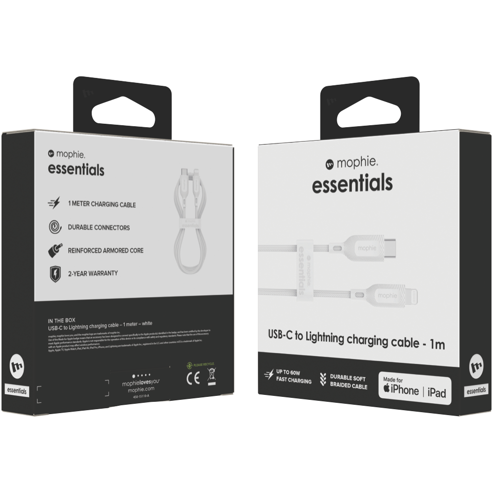 Power up your iPhone on the go with the durable Mophie Essential USB-C-Lightning Cable. This 1-metre braided cable provides a vital connection between your iPhone and USB-C power adapter or computer enabling high-speed charging and syncing. The cable's reinforced design delivers heavy-duty performance and protection against the rigours of everyday use. With a USB-C connector on one end and Lightning on the other you can conveniently juice up your iPhone using the latest chargers and power banks. Plus the cable transfers data between devices at USB 2.0 speeds up to 480Mbps. Designed for iPhones the cable transmits up to 60W of power for fast charging. And weighing just 58 grams it's lightweight and portable. The compact connectors and flexible cable make connecting straightforward while still fitting into pockets and bags. This high-quality USB-C to Lightning charger cable brings you reliable long-lasting performance. And with a 2 year warranty it's built to last. The manufacturer's part number for this product is 11901312459.