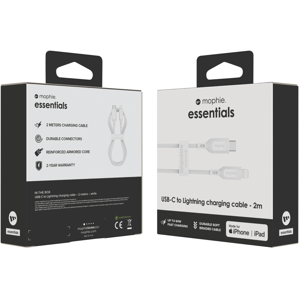 The essential connectivity you need for your iPhone - the Mophie Essential USB-C-Lightning Cable 2M White delivers dependable lightning charging and syncing in a sleek white 2 metre design. With the durable tangle-resistant cable you can power up and transfer data hassle-free while enjoying up to 2 metres of freedom. The slim connector heads plug in easily without fuss while the tough nylon-braided cable resists fraying and tangling - you can trust it stands the test of time. Now you can juice up your iPhone or sync content seamlessly at home in the car or office. Certified by Apple to meet their performance standards it works flawlessly with all latest iPhone models. So charge with confidence and stay connected on the go with this must-have lightning cable complete with an impressive 24 month manufacturer's warranty for added peace of mind.