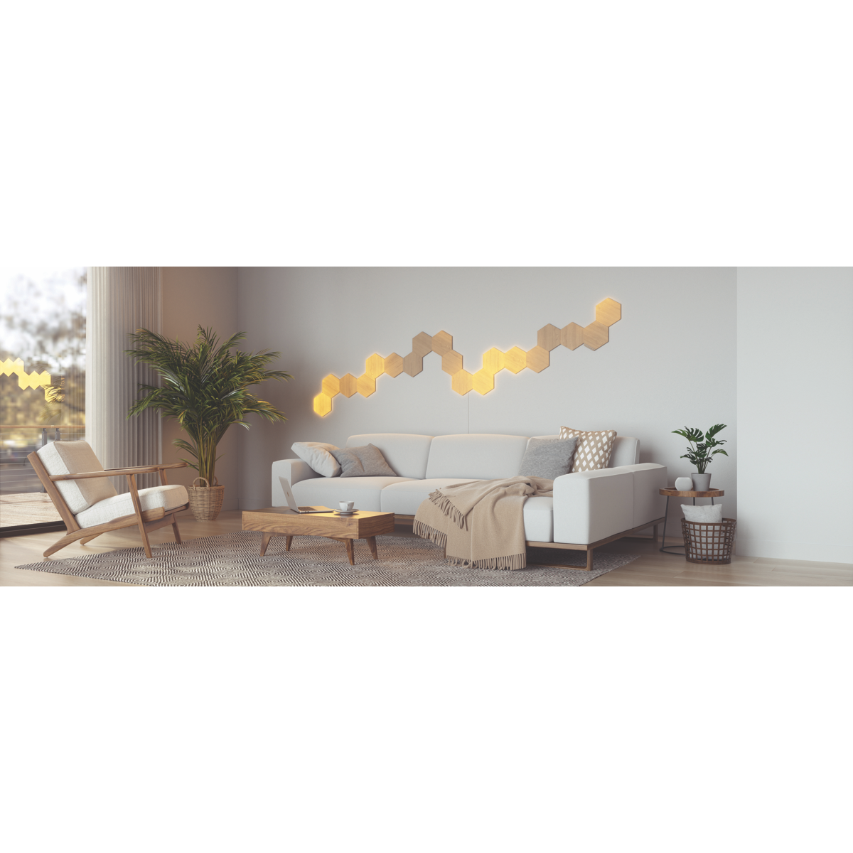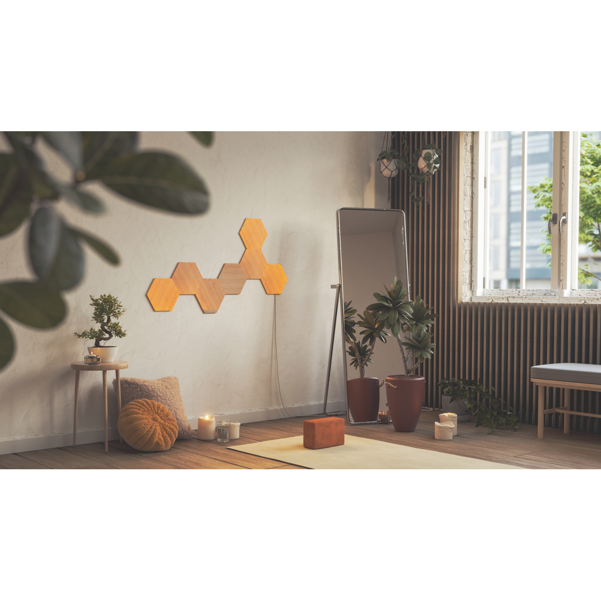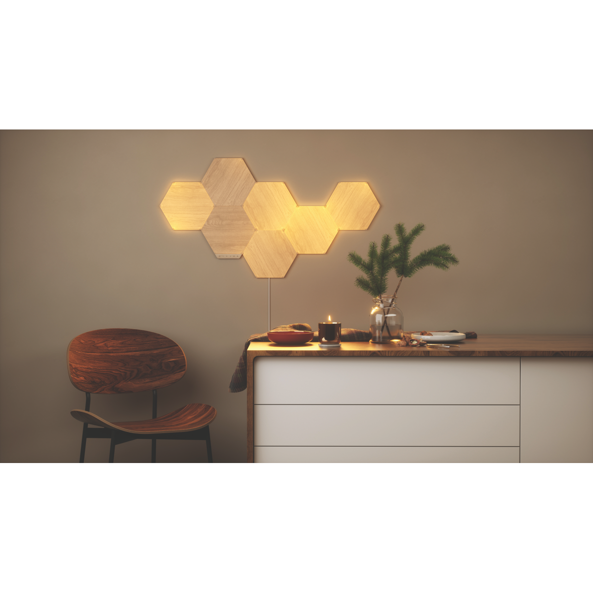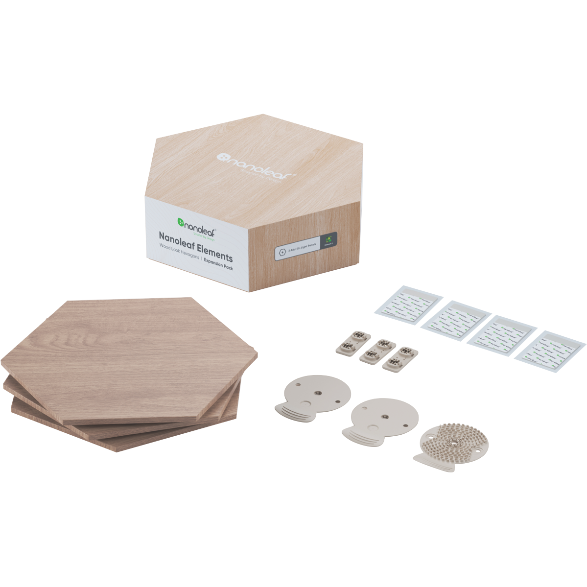 Add a stylish glow to your walls with the Nanoleaf Elements Expansion Pack. These three sleek wood-look light panels bring a warm ambience to any room. With over 16 million colors and adjustable brightness up to 22 lumens you can create the perfect lighting mood. Control the panels via the Nanoleaf app Apple HomeKit Amazon Alexa or Google Assistant. The panels connect together with included linkers and mounting plates for effortless installation. At just 200mm x 230mm these ultra-slim lights maximize your decor options. Made to last with a 25000 hour bulb life the Elements Expansion Pack lights up your life for years to come. Bring some woodsy warmth home with this three pack of Nanoleaf's innovative light panels. The manufacturer's part number for this product is NL52-E-0001HB-3PK. Discover how Nanoleaf Elements can enhance your space today.