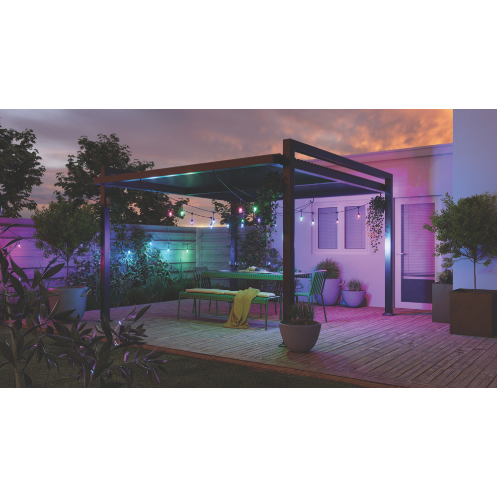 Illuminate your outdoor spaces with the captivating Nanoleaf RGB Outdoor String Starter Kit (15m). This versatile lighting solution offers a stunning array of colours ranging from warm 2700K to cool 6500K allowing you to create the perfect ambience for any occasion. With 20 bulbs delivering 55 lumens each and a remarkable 25000-hour lifespan these string lights provide long-lasting brilliance. The kit is easy to control via the Nanoleaf App on your mobile device or tablet or through the Nanoleaf Desktop App on Windows and Mac. Enjoy the convenience of voice control with Google Assistant Amazon Alexa and Apple HomeKit compatibility. The IP65 water-resistant rating ensures reliable performance in outdoor environments. The manufacturer's part number for this product is NF084K05-20SLO. Transform your outdoor area into a captivating oasis with the Nanoleaf RGB Outdoor String Starter Kit.