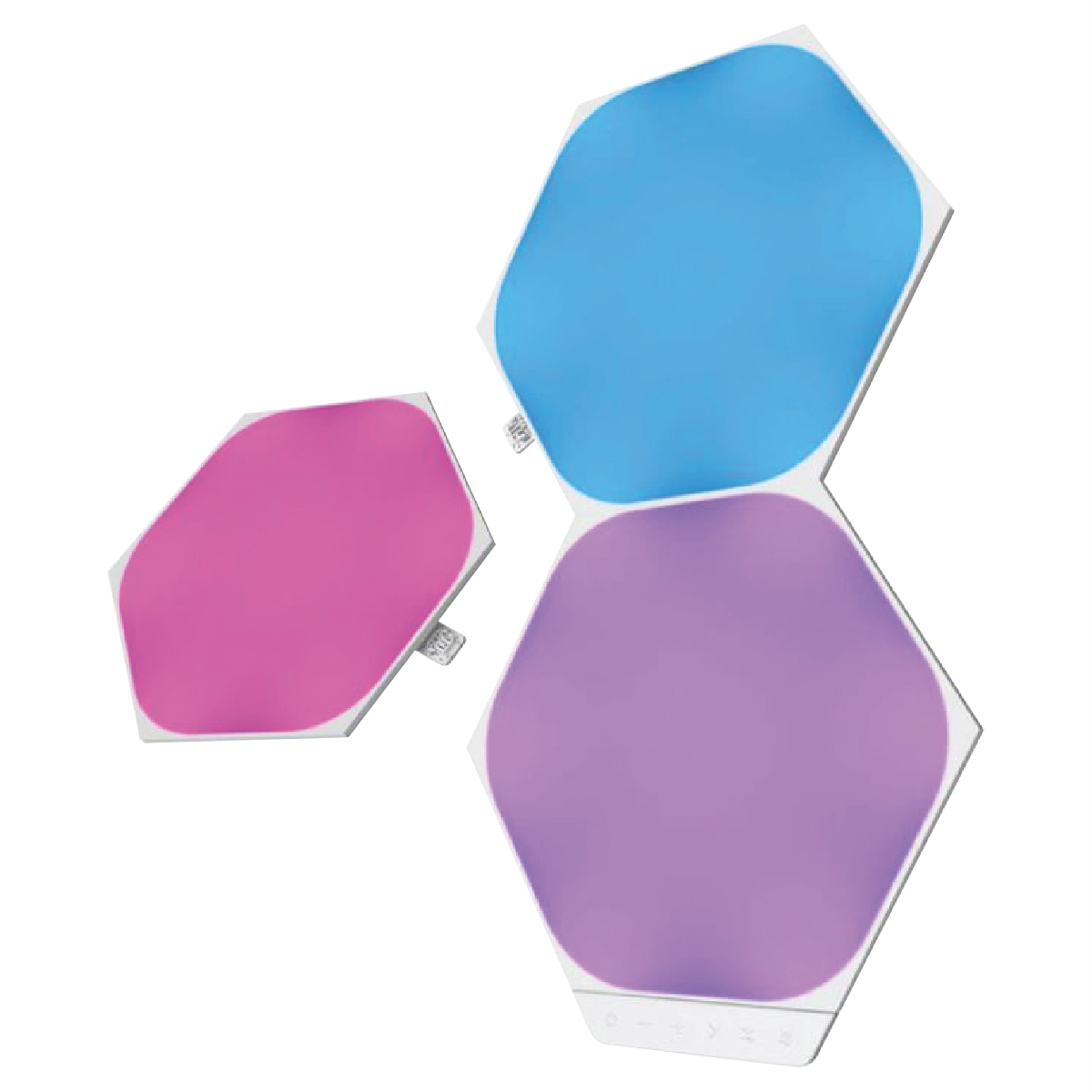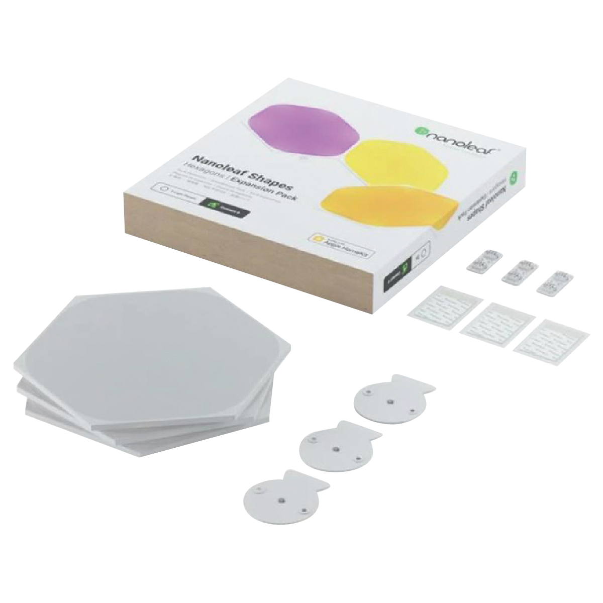 Transform your living space into an interactive light art canvas with these Nanoleaf Shapes Hexagon Expansion Panels. Seamlessly sync with your existing Shapes setup or start a whole new modular mosaic. With 16 million colours and adjustable brightness up to 100 lumens you can customize your ambience. Control your lighting experience via app voice or touch. Set schedules themes and dynamic scenes that react to music and motion. Mount the panels almost anywhere with the included adhesive strips. Connect up to 500 panels for a massive interactive display. Nanoleaf Shapes integrate with smart home ecosystems like Apple HomeKit Amazon Alexa Google Assistant and IFTTT. Whisper-quiet operation at just 21 decibels. Enjoy 25000 hours of vibrant illumination. Includes 3 mounting plates 3 hexagon light panels 3 linkers and 12 adhesive strips. Covered by Nanoleaf's 2-year warranty. Elevate your space with these ultra-customizable smart lighting panels. The manufacturer's part number for this product is NL42-0001HX-3PK.