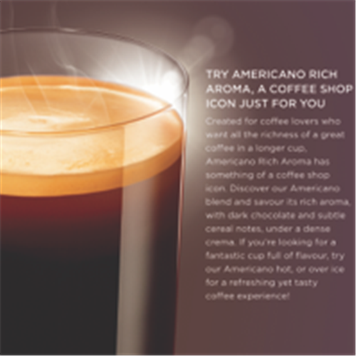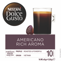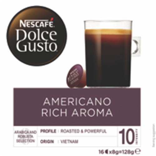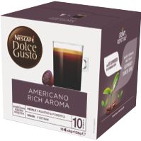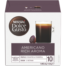 Discover NESCAFÉ® DOLCE GUSTO® Americano Rich Aroma. Our talented coffee creators have blended Vietnam origin Arabica and Robusta coffee beans. This long cup is an elegant coffee with fruity and floral notes a medium body and a fine crema. Americano Rich Aroma is enjoyed best in a large mug. With or Without milk. The box contains 16 capsules designed for NESCAFÉ® DOLCE GUSTO® capsule coffee machines for you to prepare 16 cups of Americano Rich Aroma. Simply slide your Americano capsule into your NESCAFÉ® DOLCE GUSTO® machine. Our expertise is creating great-looking great-tasting coffee. The team at NESCAFÉ® DOLCE GUSTO® has joined forces with TerraCycle® to collect and recycle your used capsules preventing them from ending up in landfill and giving the capsule materials a second life!