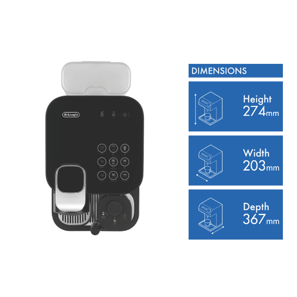 Additional Features 9 One touch recipes: Espresso (40 ml), Ristretto (25 ml), Lungo (110 ml) and 6 milk recipes for Cappuccino, Latte macchiato, Hot foam, Flat white, Caffelatte, Hot milk, Lattecrema system, Sliding drip tray, Mechanic ejection of capsules, Collecting tank f
