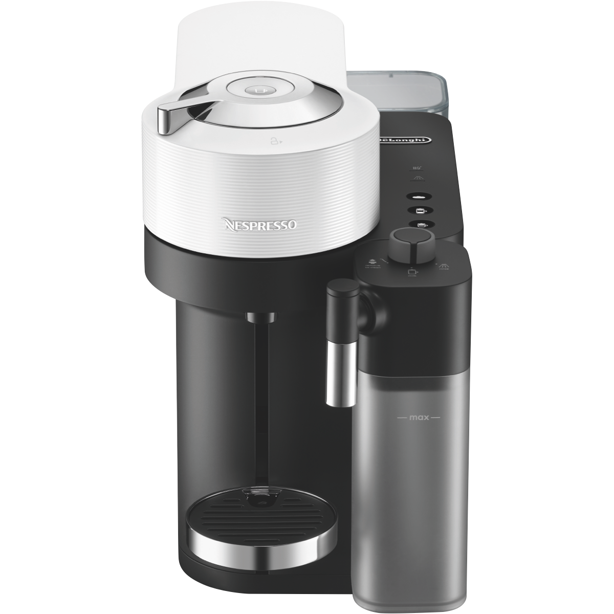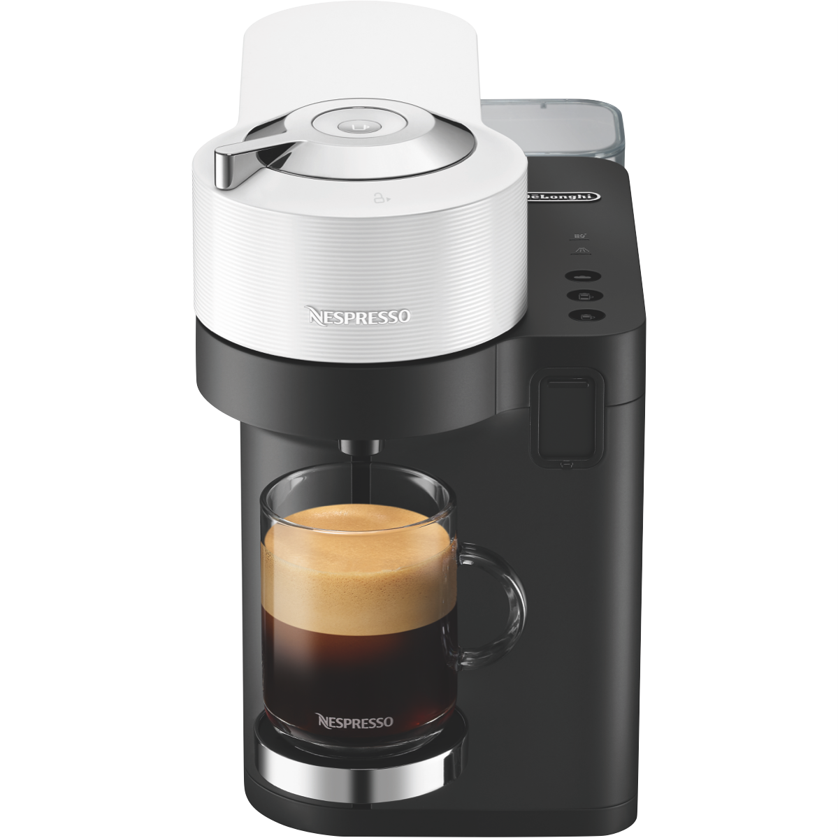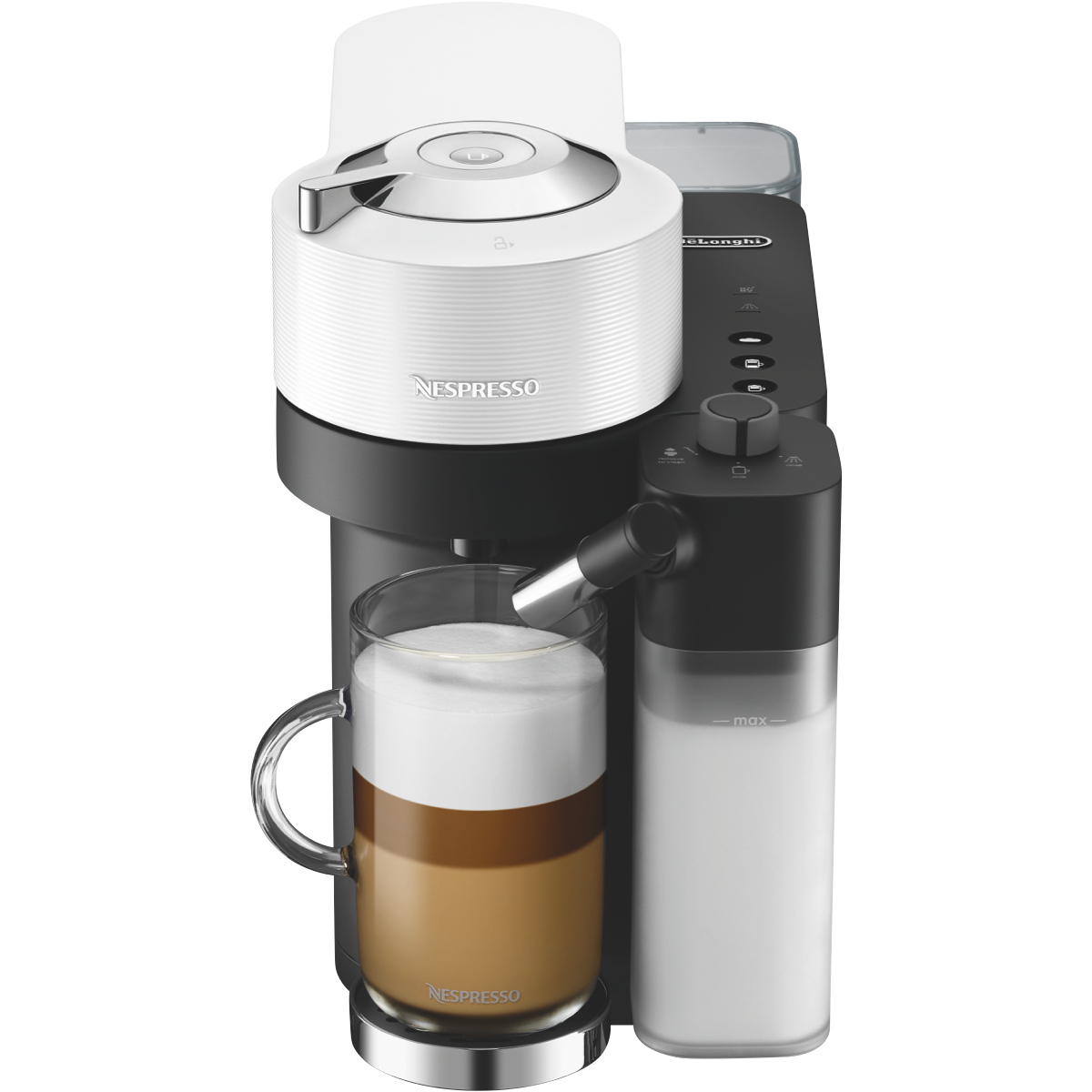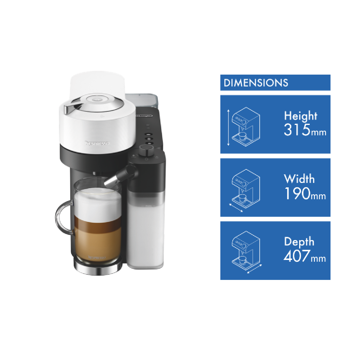Elevate your daily coffee ritual with the elegance and convenience of the Nespresso Vertuo Lattissima Matte White capsule coffee machine. This sleek 1300-1500 watt coffee maker delivers barista-style beverages in the comfort of your home with just the touch of a button. The Vertuo Lattissima produces 6 cup sizes from a single espresso to an alto as well as 3 milk-based recipes like cappuccino and latte macchiato at the ideal temperature every time. The built-in frothing wand makes luscious creamy foam to customize your drinks exactly as you like them. This versatile machine accommodates both espresso and coffee capsules with Centrifusion technology that optimizes parameters like brewing time temperature and water pressure for each blend. With a fast 25 second heat-up time 1.7L removable water tank an automatic alert when it's time to descale and dishwasher safe parts for easy cleaning the Lattissima takes the effort out of making coffee house quality beverages at home. Crafted in matte white plastic with a compact footprint the Vertuo Lattissima adds modern style to your countertop. Brew cafe favorites your way with the one-touch simplicity of Nespresso s Vertuo Lattissima capsule coffee machine. The manufacturer's part number for this product is ENV300W.