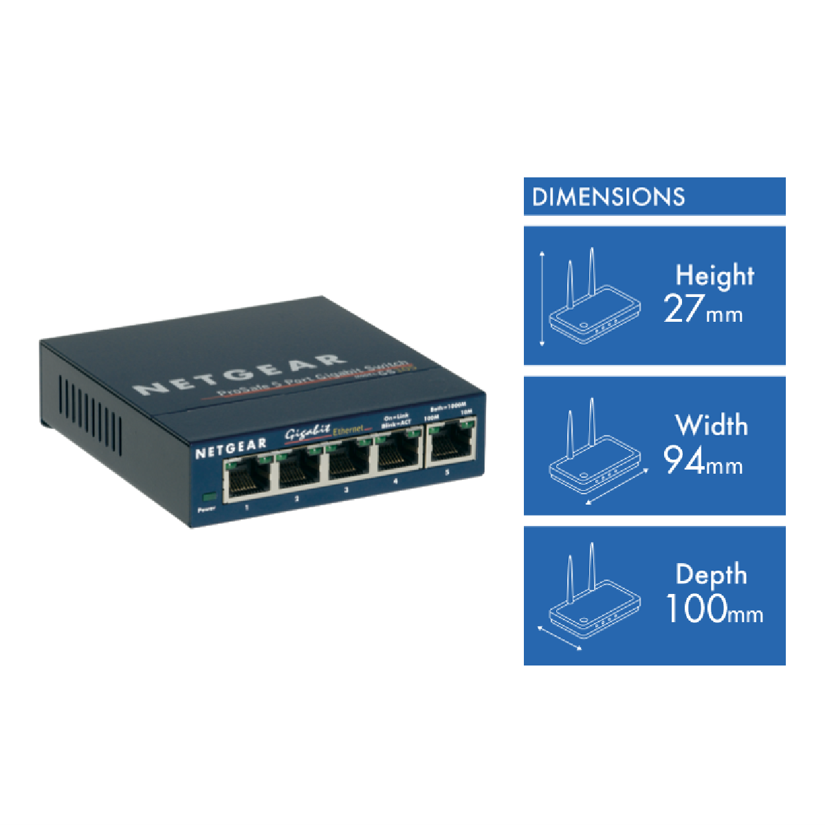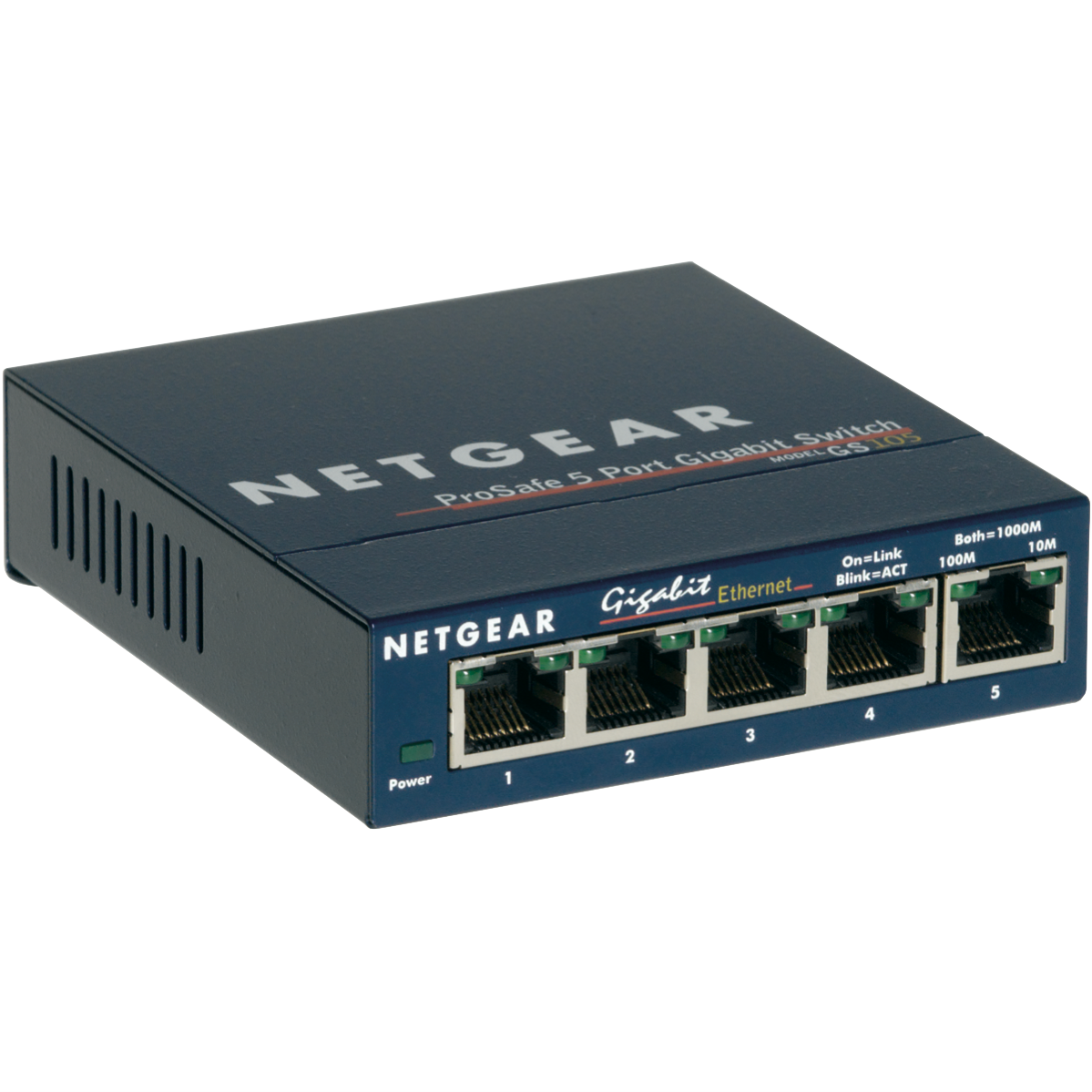 Take your home or office network to the next level with the Netgear ProSafe 5-port Gigabit Switch. This essential networking accessory lets you expand your high-speed network in an instant delivering rapid file transfers and lag-free streaming across multiple devices. Simply plug it in and connect up to five wired devices for speeds up to 10 times faster than standard Ethernet. With its sturdy compact design and plug-and-play setup the Netgear switch offers hassle-free performance right out of the box. Auto-negotiation on each port detects device connections while auto-mdi/mdix eliminates the need for crossover cables. Prioritize bandwidth-hungry applications like video conferencing with optimized traffic handling. Robust QoS automatically recognizes voice and video streams ensuring glitch-free calls and stutter-free streaming. With energy-efficient operation and silent fanless cooling this versatile gigabit switch integrates seamlessly into any home or office. Take your wired connections to the cutting edge with the easy affordable network expansion of the Netgear ProSafe 5-port Gigabit Switch. The manufacturer's part number for this product is GS105. Get yours today for a faster more reliable network.