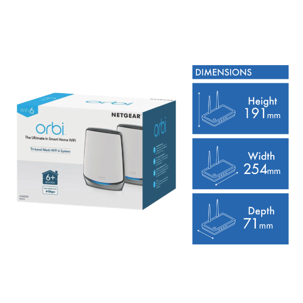 Take your home Wi-Fi to the next level with the Netgear Orbi AX6000 TriBand Mesh WiFi System. This powerful dual unit mesh system blankets your home in fast reliable WiFi 6 coverage up to 5000 square feet. The dedicated tri-band backhaul ensures a strong connection between the router and satellite for robust performance. Enjoy combined wireless speeds up to 6Gbps and connect wired devices via five Gigabit Ethernet ports. Protect all connected devices with comprehensive security features like firewall anti-virus and data theft protection. Manage content and time limits for kids across all devices. The intuitive app makes it easy to set up and control your network. With its modern design and compact footprint this system seamlessly blends into any home décor. For those seeking the ultimate in wireless performance and coverage for medium to large homes the Netgear Orbi AX6000 is a superb choice. The manufacturer's part number for this product is RBK852-100AUS.
