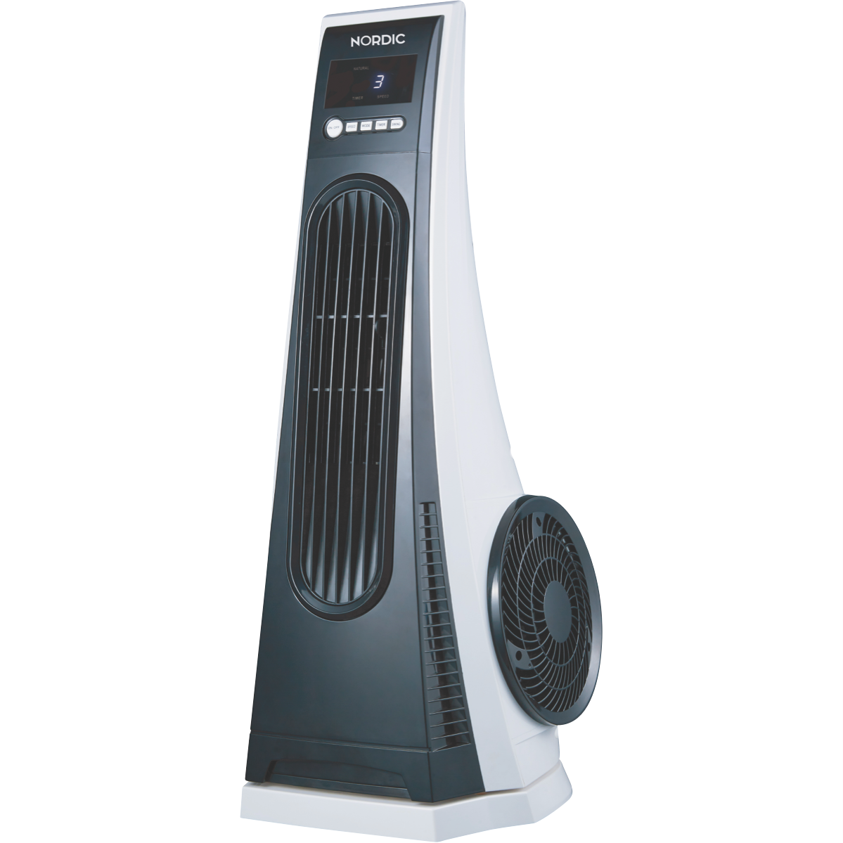 Escape the summer heat with the Nordic 77cm Turbo Tower Fan. This white and black fan features wide-angle oscillation to circulate air throughout the room helping you stay cool and comfortable. With two speeds 8-hour timer and LED display you can customize airflow to suit your needs. The remote control allows you to adjust settings without leaving the couch. This 288mm wide 765mm high tower fan includes a 1-year warranty and manufacturer's part number TF101N. Make your home an oasis this season with the Nordic Turbo Tower Fan.