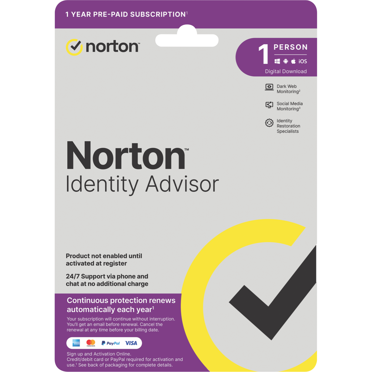 Protect your identity and stay secure online with Norton Identity Advisor. This internet security software helps safeguard your personal information and devices against online threats. It monitors suspicious activity across your accounts and the dark web to alert you about identity theft and fraud. Customised guidance and restoration services help resolve identity theft issues swiftly. With advanced security technology Norton Identity Advisor secures your digital footprint across PCs Macs smartphones and tablets. It ensures your online transactions remain private while blocking malware phishing attempts and malicious links. This software also helps manage passwords and scans Wi-Fi networks for vulnerabilities. Rest easy knowing your identity is shielded from cybercriminals. Norton Identity Advisor provides comprehensive cyber safety so you can browse shop and bank online with confidence. The manufacturer's part number for this product is AUSYMGG29.