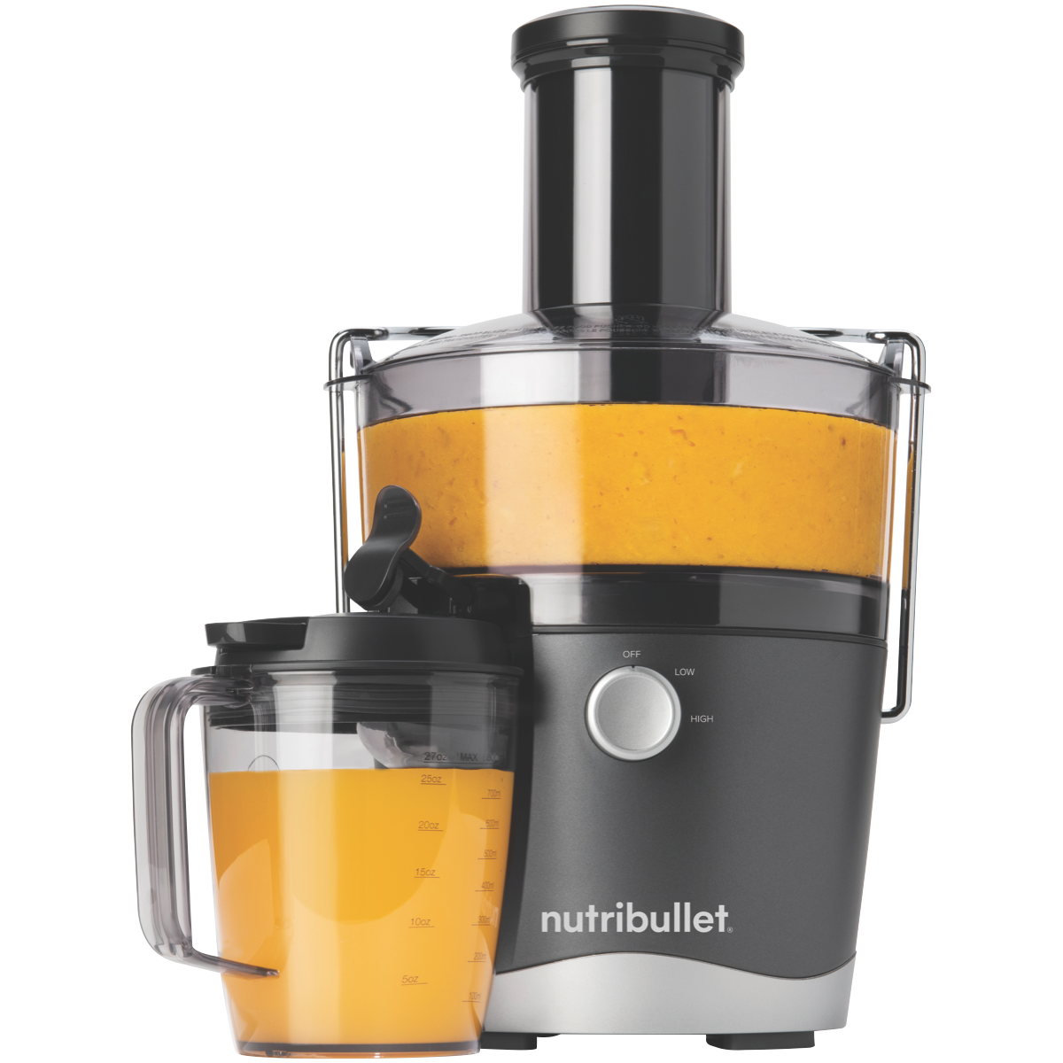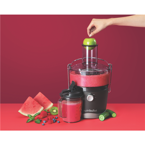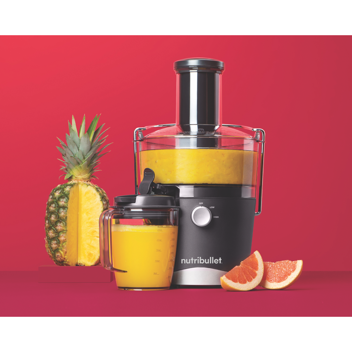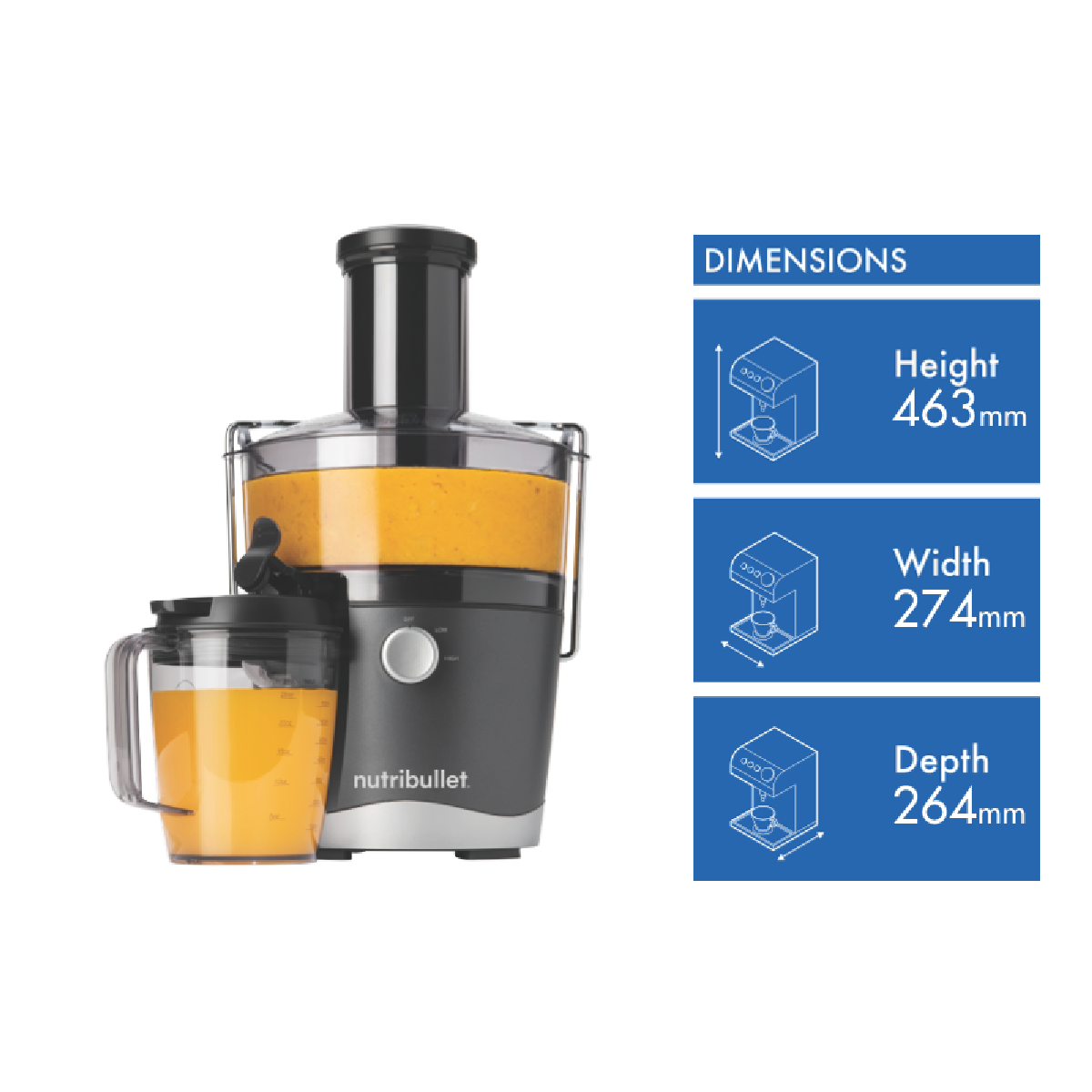 A delicious fast and effective way to get your daily recommended serving of fruit and veg the compact Nutribullet Juicer is all about making juicing simple enough for everyday use. A 7cm feed chute accommodates whole fruits and vegetables so you can juice quickly with no slicing or dicing required. The dual-speed control dial offers straightforward operation with either the Low setting for softer fruits such as kiwi banana berries or oranges; or High for dense foods like carrots and beets. It has a generous capacity 1.5-litre pulp container with a no-drip sprout to ensure the extracted juice gets fed through to the 800ml juice pitcher without any leaks and messes. Plus the lid of the juice pitcher allows you to store fresh juice for up to 48 hours for make-ahead grab-and-go convenience. For effortless clean up all components except for the food pusher and motor base are dishwasher safe. For plenty of juicing inspiration a recipe book is included for making a variety of immune-boosting juices.