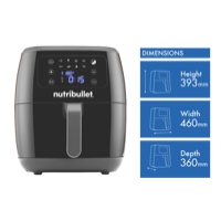 Create healthful delicious dishes using little oil with the Nutribullet XXL Digital Air Fryer NBA07100 - an all-in-one air fryer that roasts bakes dehydrates and crisps family-sized portions of your favourite foods to perfection. There are eight pre-set cooking modes including Fry for crispy chips in as little as 15 minutes or Poultry to cook a whole large chicken fast by the 360-degree Vortex convection technology that distributes heat evenly around food to reduce cooking time significantly. You can also customise your cooking with manual time and temperature settings. This Nutribullet air fryer has a large 7-litre capacity a wide temperature range to fry a variety of foods and is easy to clean with its BPA-free non-stick cooking basket and crisping tray that are top-rack dishwasher safe.