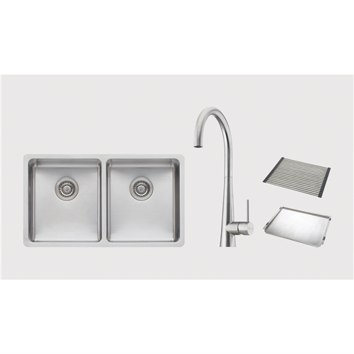 Bring modern style and convenience to your kitchen with the Oliveri Grab and Go Pack SN63TU + SS2520. This sleek stainless steel sink and tap combo delivers superior functionality to streamline food preparation and cleanup. The pack includes a durable Oliveri Sonetto double bowl sink crafted from thick 304 grade stainless steel. With a brushed finish and deep bowls it provides ample space for washing dishes rinsing produce and more. The sink features a contemporary topmount or undermount installation and boasts a lifetime warranty for lasting quality. Also included is an Essente gooseneck mixer tap. Enjoy water efficiency with a 4 star WELS rating. Together the sink and tap offer an elegant coordinated look with reliable performance. Upgrade your kitchen with this versatile stainless steel combo pack - contact us today to learn more. The manufacturer's part number for this product is SN632520-PK.