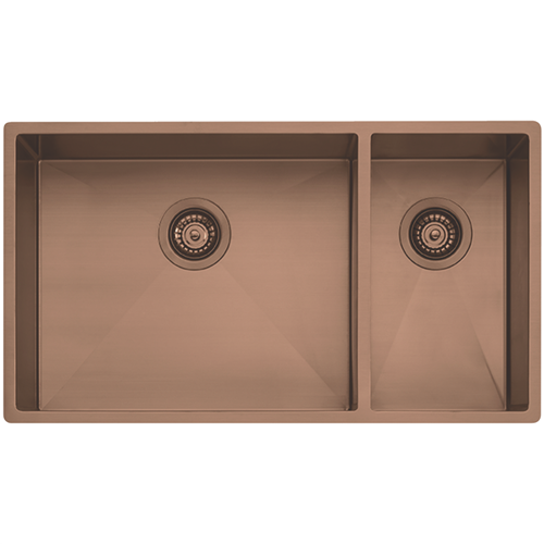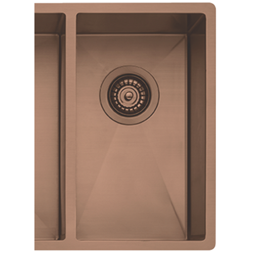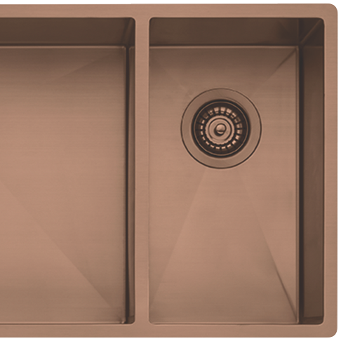 Craft a stylish and functional kitchen with the Oliveri Spectra 1 & 1/2 Bowl Copper Sink. This undermount sink is made of durable 304 grade 18/10 coloured stainless steel with a striking copper finish that makes a bold statement. Featuring a large 40L bowl and handy 18L half bowl this versatile double sink provides ample space for washing dishes and preparing meals. The two included 90mm coloured basket wastes add a cohesive look while promoting efficient drainage. With a lifetime manufacturer's warranty you can install this sink with confidence for long-lasting beauty and reliability. The minimal 900mm cabinet size ensures this sink will fit seamlessly into your kitchen. Bring contemporary glamour to your home with the Oliveri Spectra. SB35CU is the manufacturer's part number for this product.