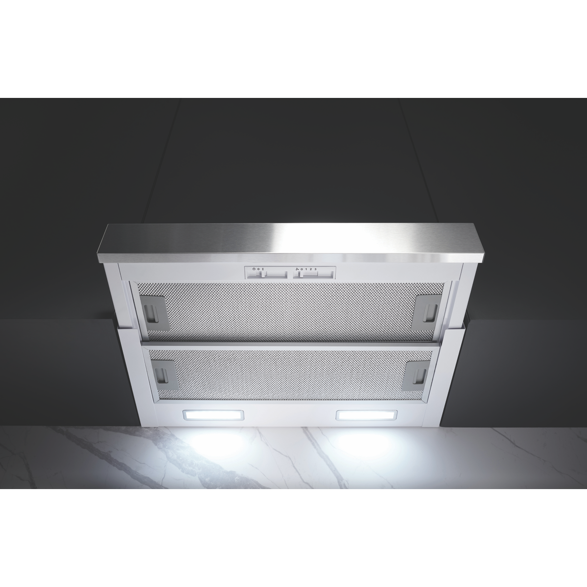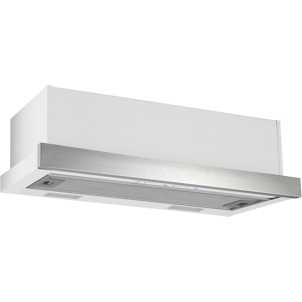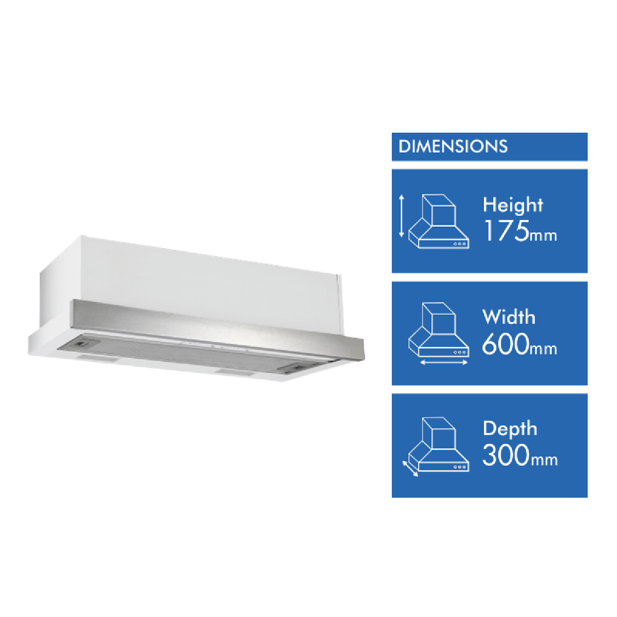 Slide this sleek 60cm wide Omega rangehood effortlessly into your kitchen cabinetry to keep cooking odours and grease at bay. With a streamlined stainless steel fascia and white body this ducted or recirculating slideout hood adds a touch of modern style while powerfully clearing the air. Its 378m3/hr extraction capacity swiftly eliminates cooking fumes through three fan speeds operated via a slide control switch. The two integrated LED lights brightly illuminate your cooktop while the two aluminium filters trap grease and are conveniently dishwasher safe. At just 68 decibels operation is quiet enough for comfortable conversation. Installation is simplified with a compact 175mm height that fits under standard cabinets. Designed for reliability and longevity this rangehood comes with a 2 year manufacturer's warranty. The manufacturer's part number for this product is ORT6WXA. Discover how this Omega rangehood can refresh your cooking space today.