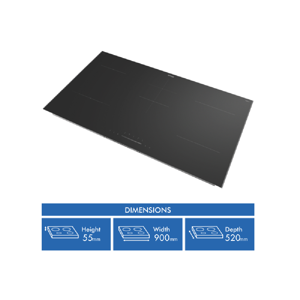 • Electric 90cm cooktop with 5 zones, touch controls