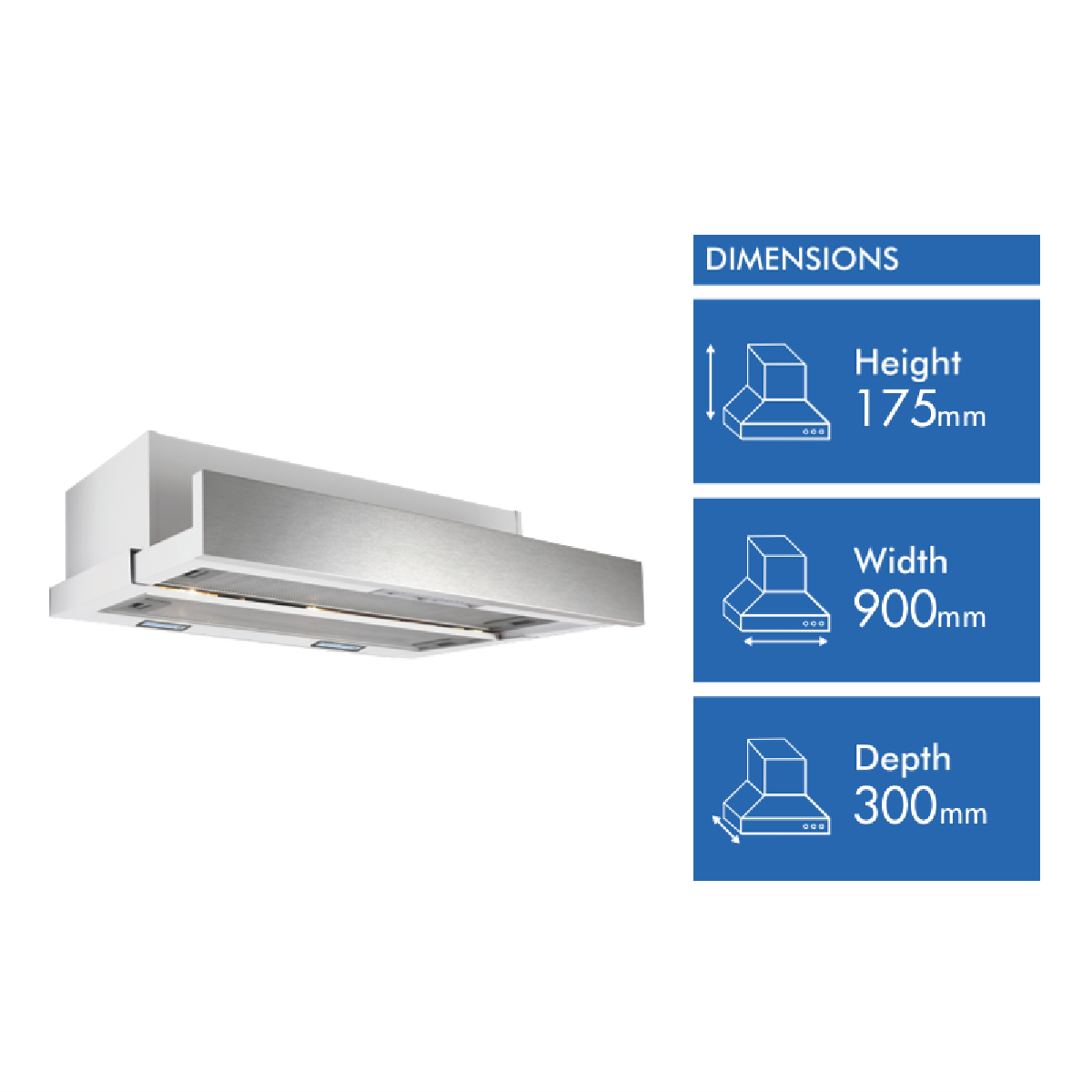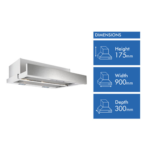 This Omega rangehood is a slideout hood. Remove smoke and vapours with its 440 cu m/hr extraction capacity. The Omega ORT9WXL has LED lighting allowing you to keep a close eye on cooking. The Omega rangehood's switch controls help you lower the light when it's time for dining. Plus it has a white and stainless steel finish. The rangehood has a 900mm width with a 175mm height. You can improve the air quality in your kitchen thanks to this Omega rangehood.