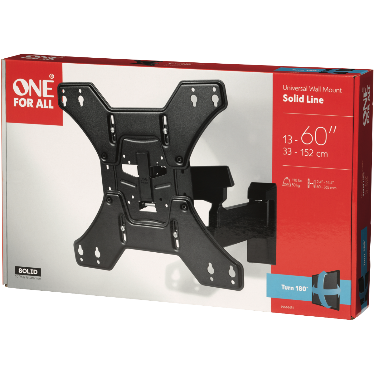 Bring your entertainment to life with the One For All 13-65 Turn180 50kg TV Bracket. This versatile wall mount is designed to securely hold TVs from 13 to 65 inches with a maximum weight capacity of 50kg. Extend swivel and tilt your TV up to 180 degrees for the perfect viewing angle from anywhere in the room. The Turn180 extends 60 to 365mm from the wall and is compatible with VESA patterns up to 400 x 400mm. With a sleek low profile and space-saving fold-away design this mount maximizes your viewing while minimizing its footprint. Crafted from heavy-duty steel the Turn180 delivers strength and durability you can rely on for years to come. Stop straining your neck and easily adjust your TV with the smooth tilt and swivel motions. Create an immersive home theatre experience and reduce glare with customized positioning. With a lifetime warranty you can install your TV with confidence and enjoy endless entertainment. The manufacturer's part number for this product is WM4451. Discover effortless TV positioning with the One For All Turn180 TV Bracket today.
