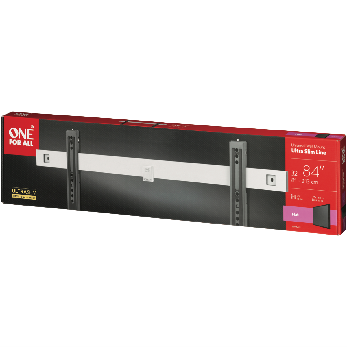 Take your TV viewing experience to new heights with the One For All 32-90 UltraSlim Flat 80kg TV Bracket. This sleek and sturdy wall mount is designed to securely hold TVs from 32 to 90 inches with a maximum weight capacity of 80kg. The ultra-slim profile sits your TV just 13mm from the wall creating a floating cinematic effect. With its full motion capabilities you can tilt and swivel your TV up to 180 degrees for the perfect viewing angle from anywhere in the room. The easy-to-install wall plate and adjustable VESA mounting pattern from 600 x 400mm ensures a customisable fit for your TV model. Crafted from heavy-duty steel this durable bracket mounts your TV securely while maintaining a slim minimalist aesthetic. Give your living room a contemporary facelift and enjoy your favourite movies shows and games on a TV that looks like a work of art. With a lifetime warranty from One For All you can enjoy long-lasting performance from this high-quality TV wall bracket. The manufacturer's part number for this product is WM6611.